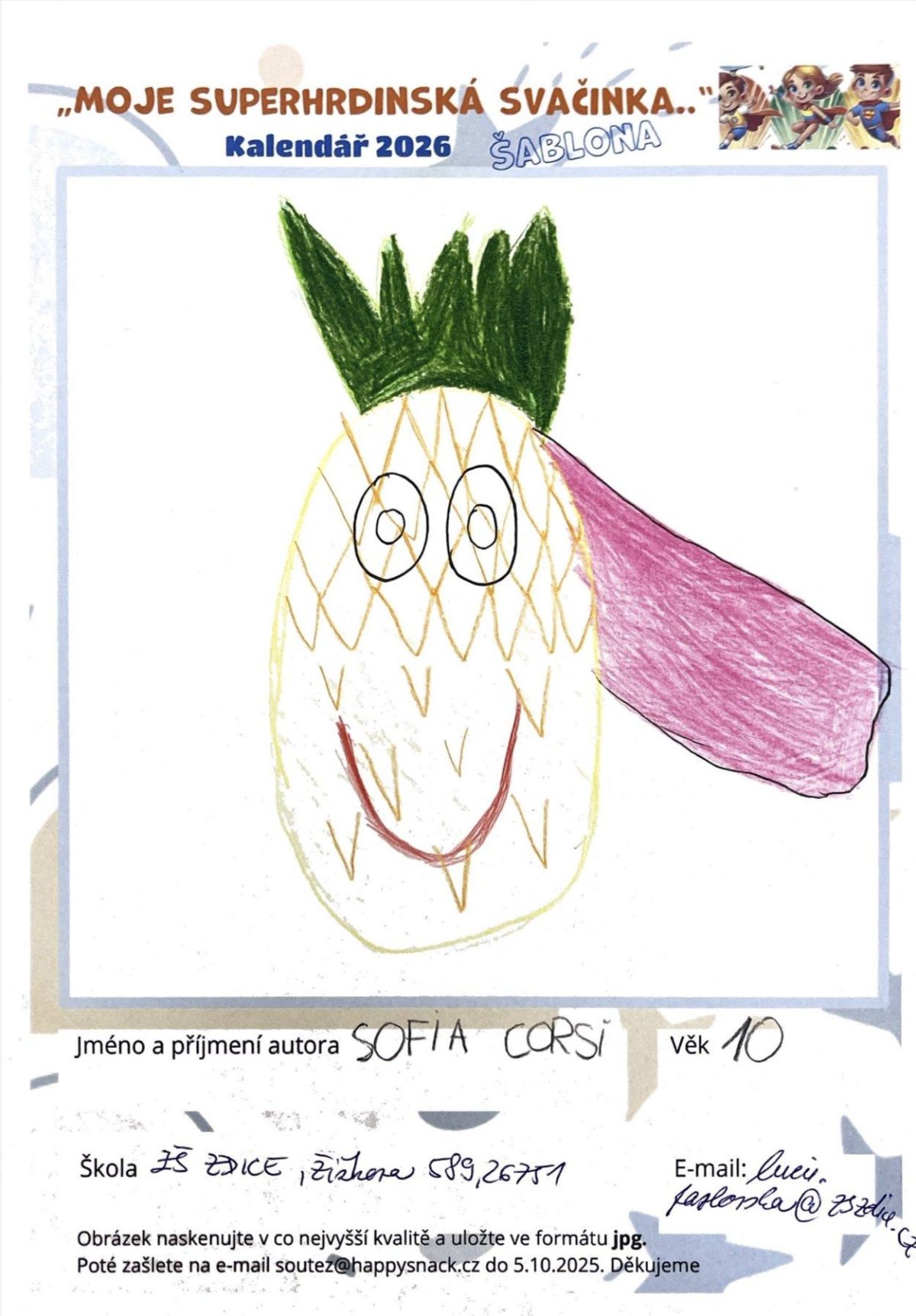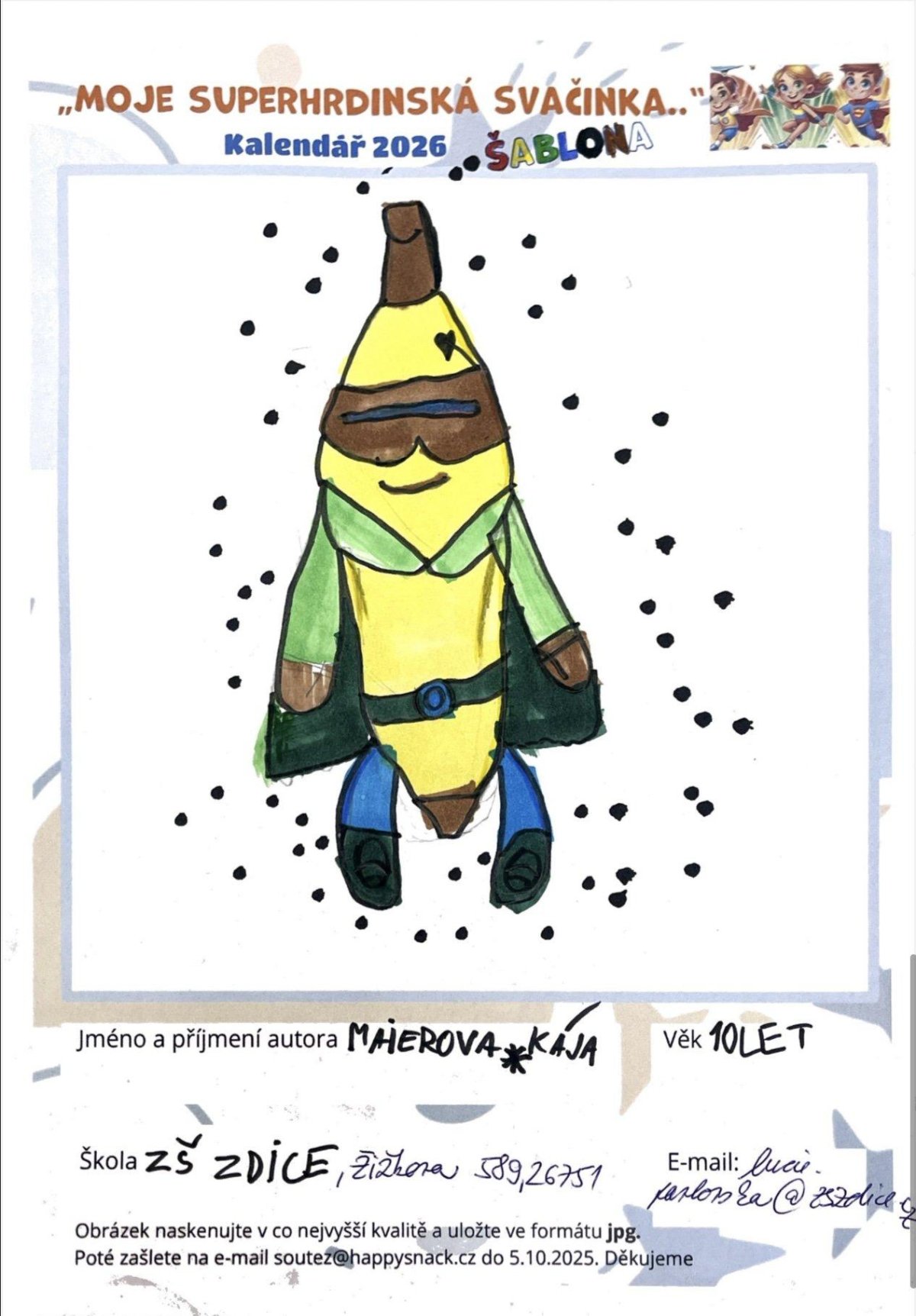 Náš školní klub se v letošním roce zapojil do výtvarné soutěže „Kalendář Happysnack 2026“ s mottem „Moje superhrdinská svačinka“. Úkolem dětí je nakreslit či namalovat obrázek své oblíbené zdravé svačinky, která se promění v superhrdinu s nadpřirozenými schopnostmi.