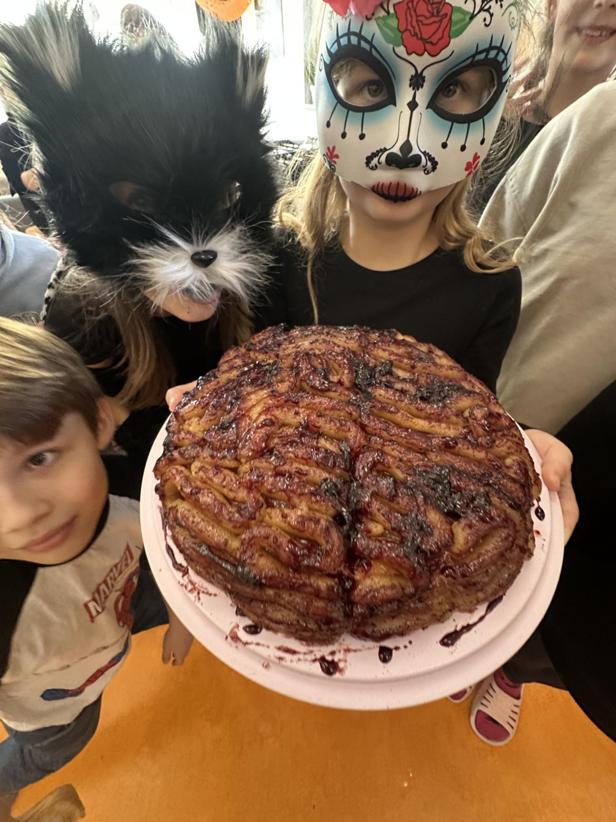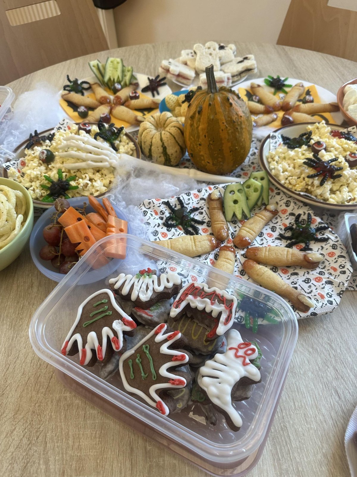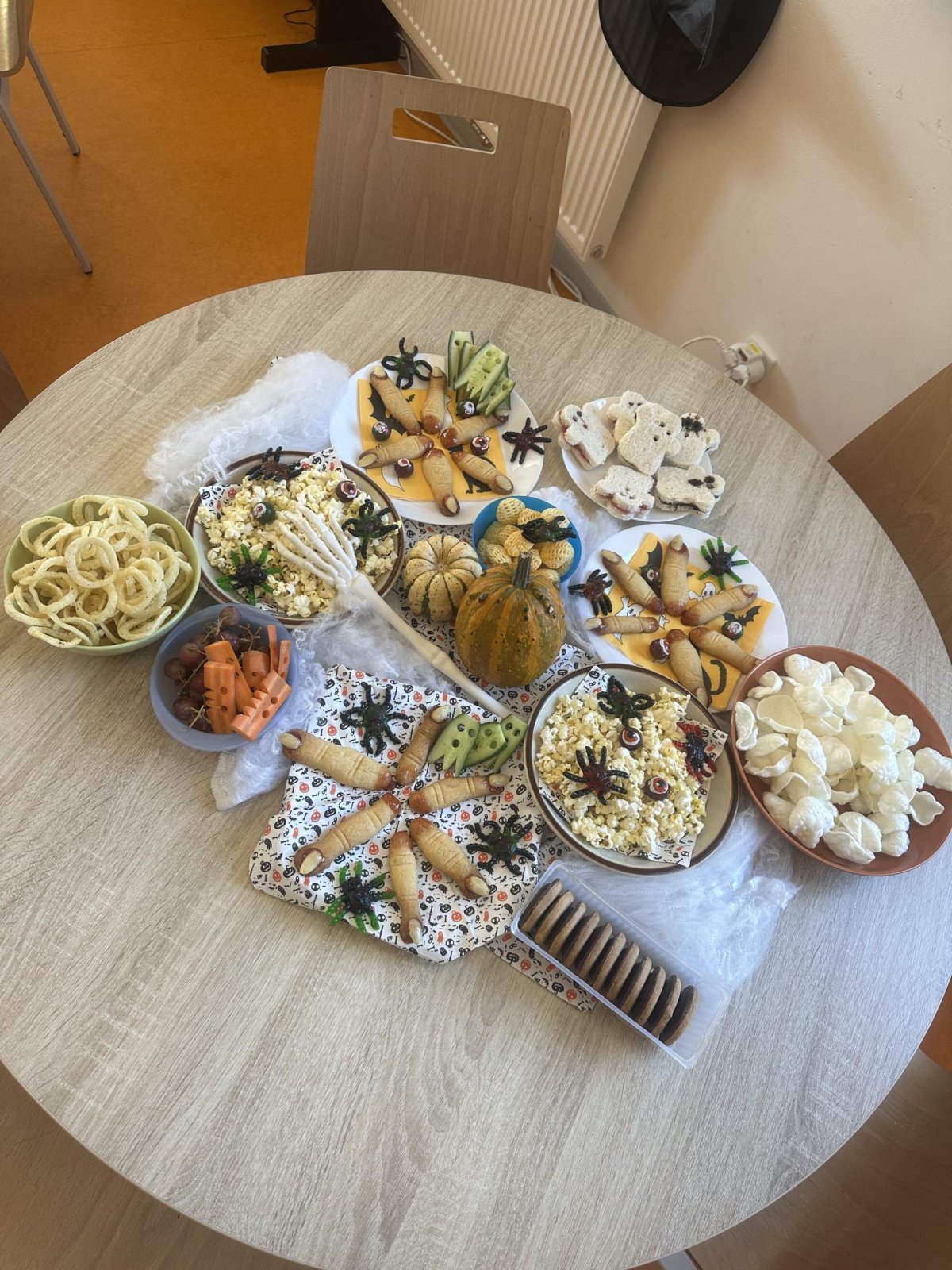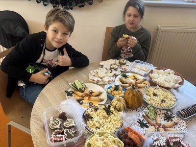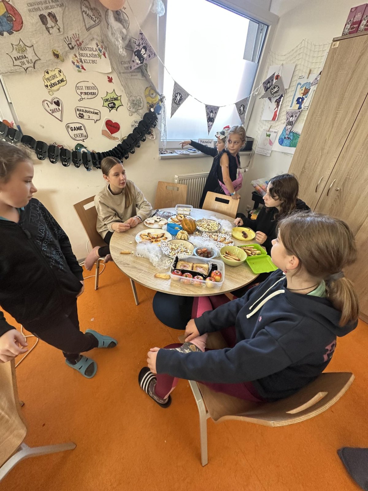 Nechybělo ani občerstvení, které děti a rodiče přinesli – na stolech se objevilo mnoho sladkých i slaných jídel, včetně originálního dortu ve tvaru mozku.
