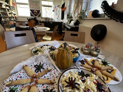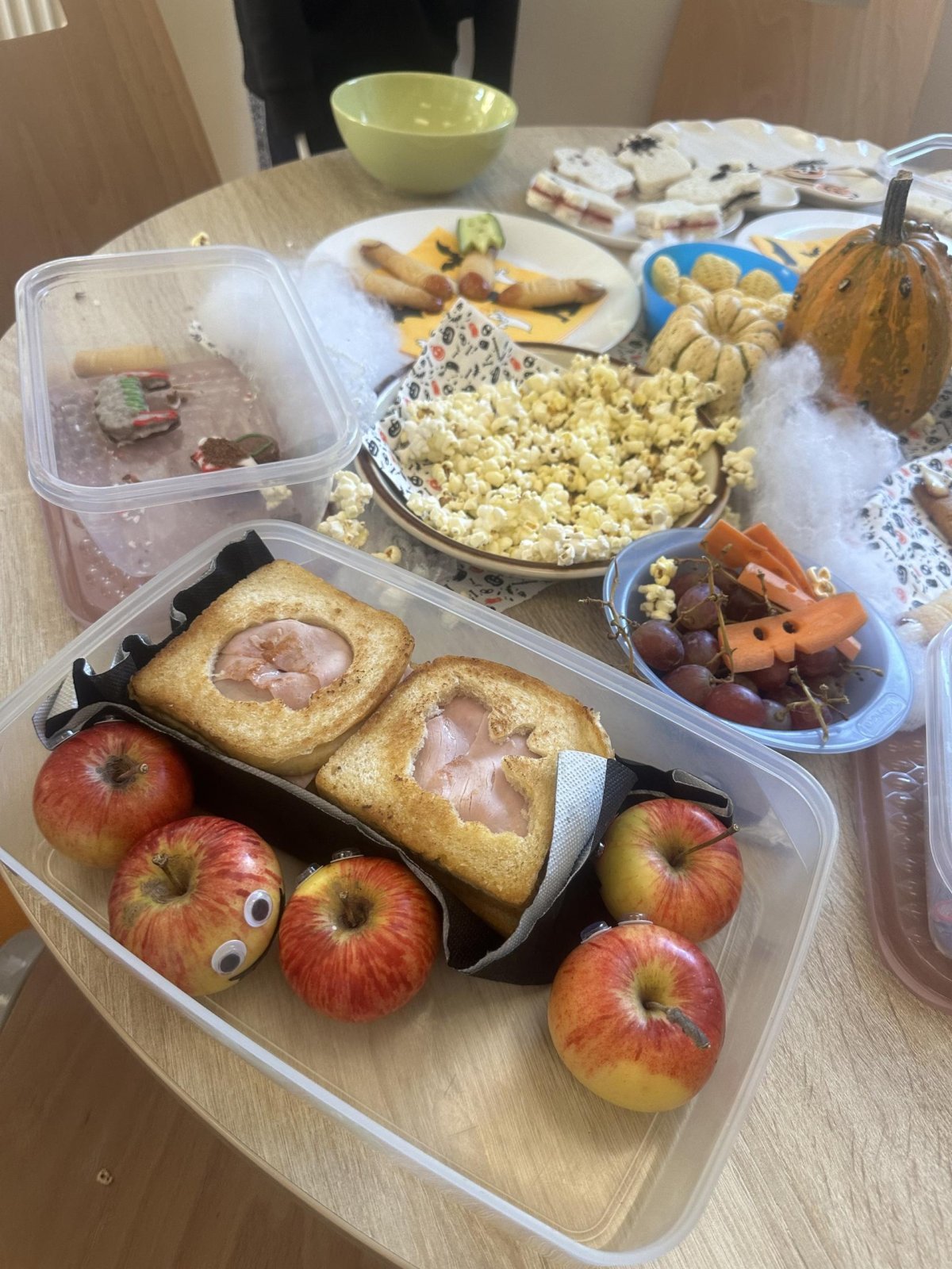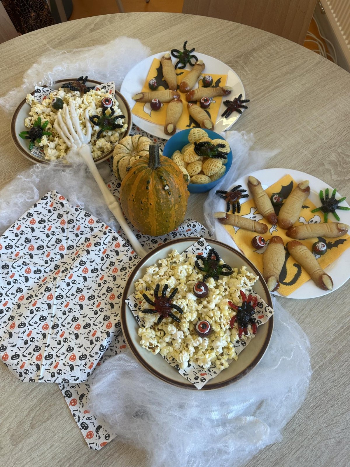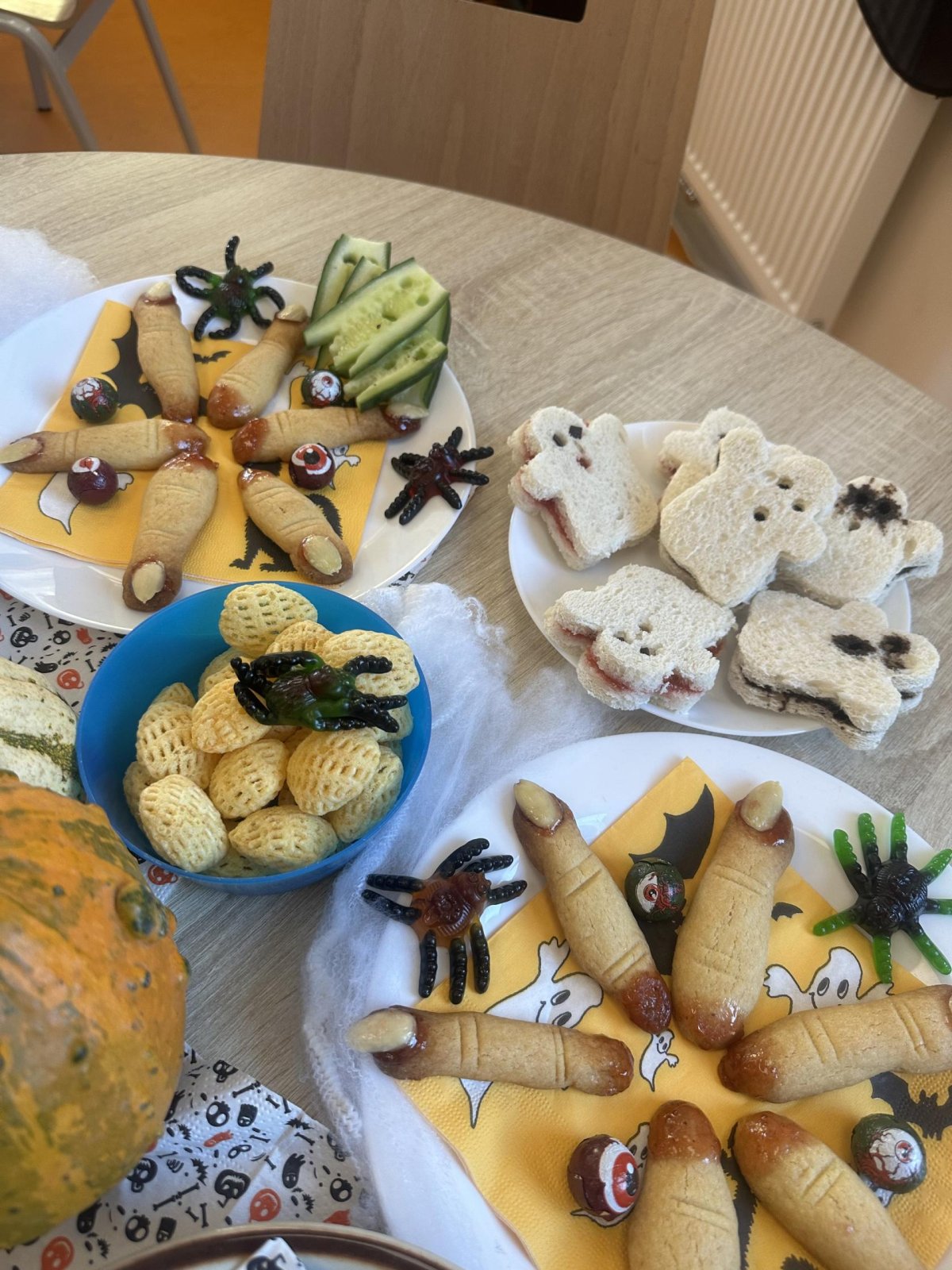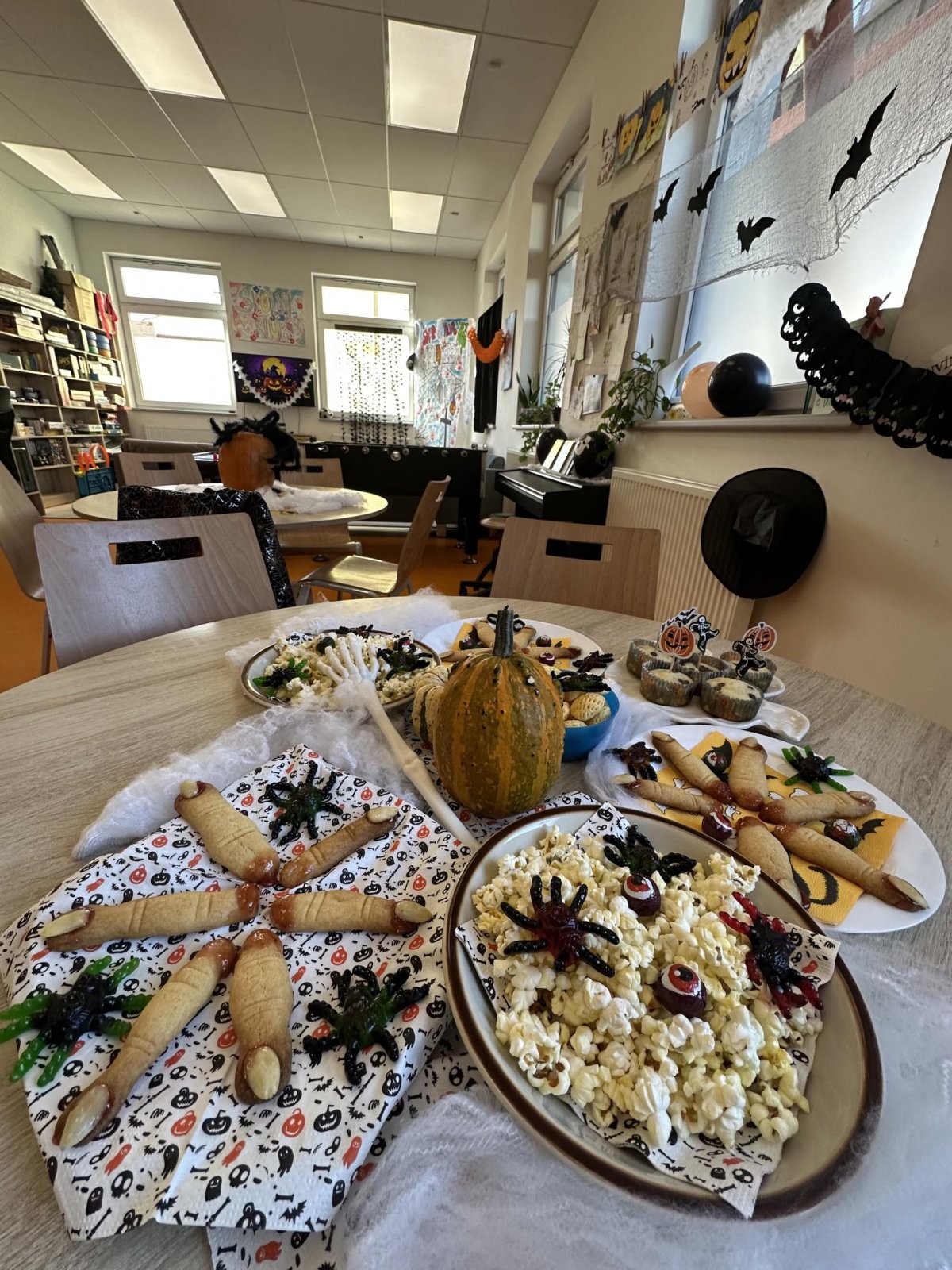 Nechybělo ani občerstvení, které děti a rodiče přinesli – na stolech se objevilo mnoho sladkých i slaných jídel, včetně originálního dortu ve tvaru mozku.