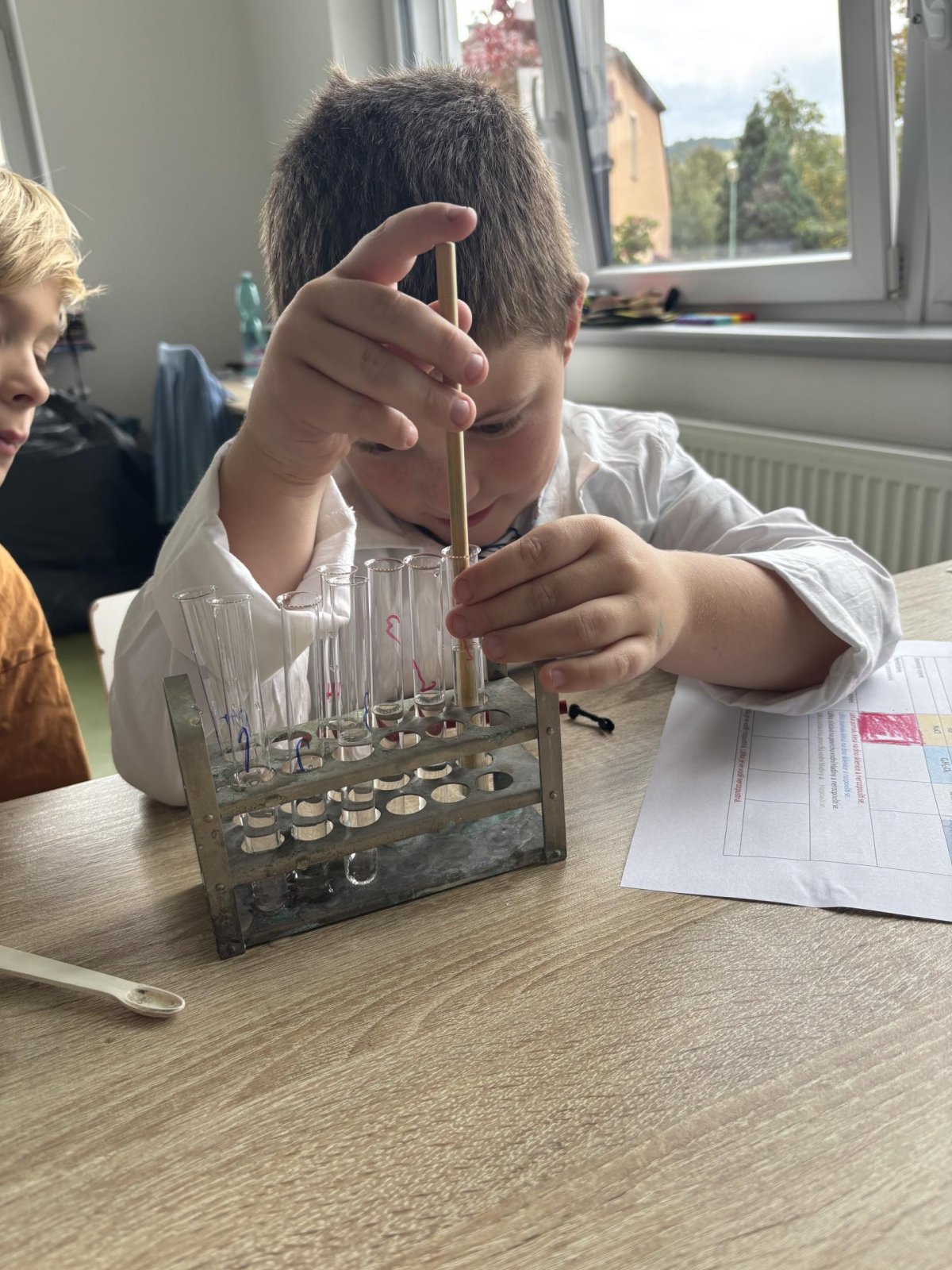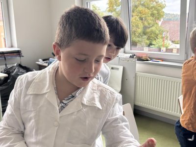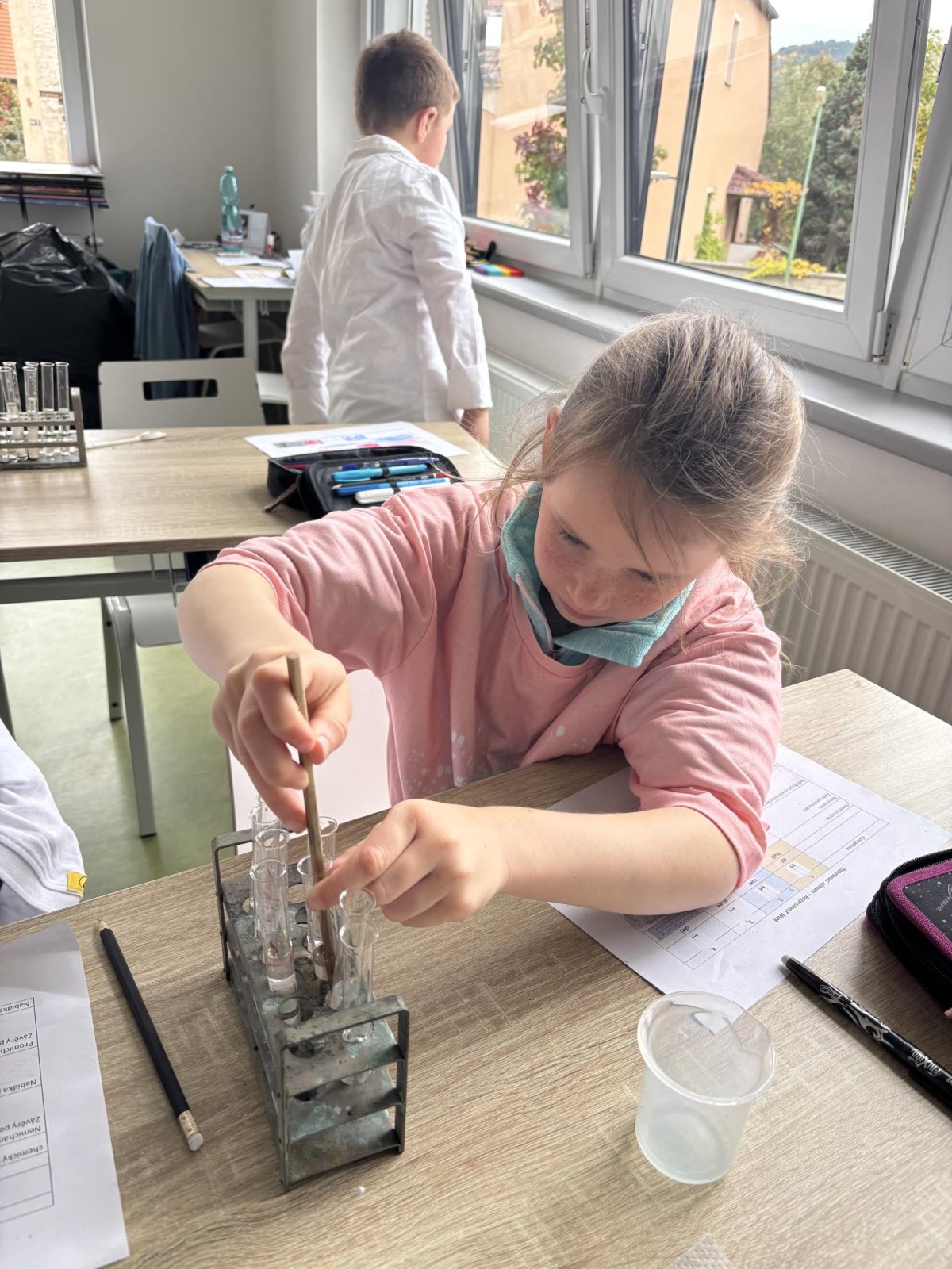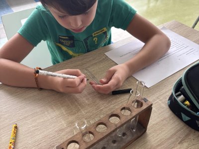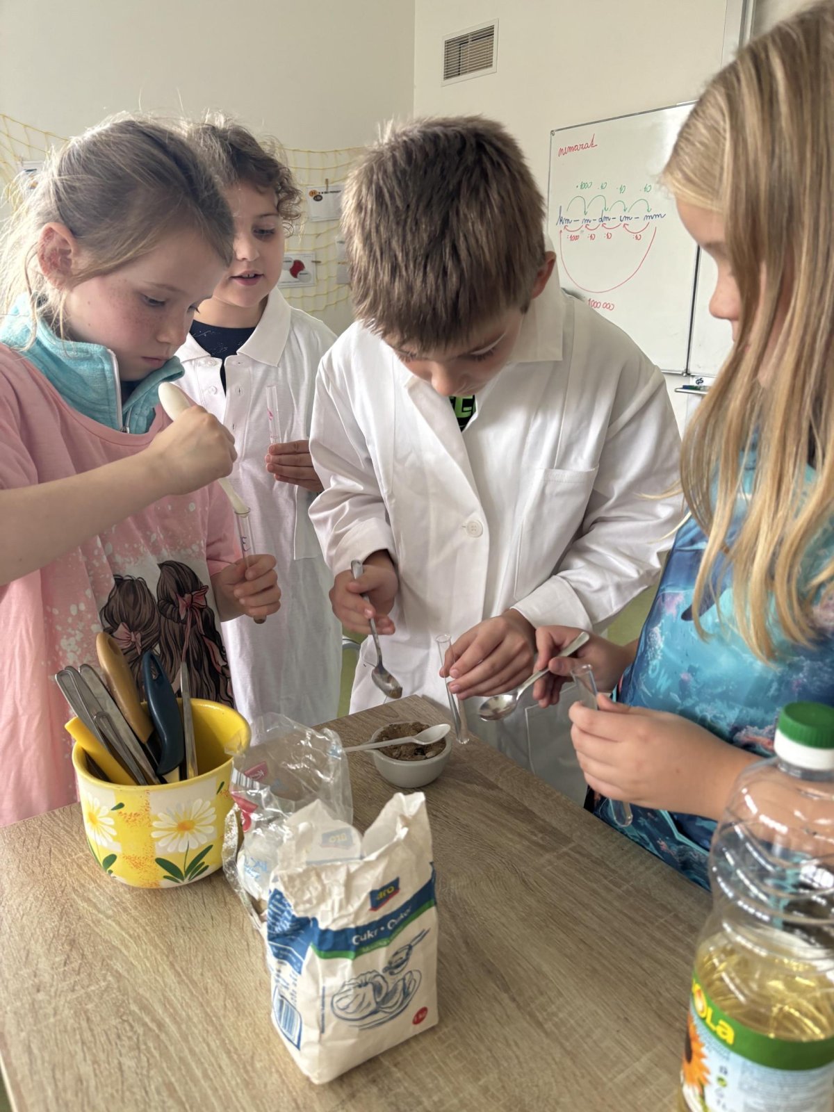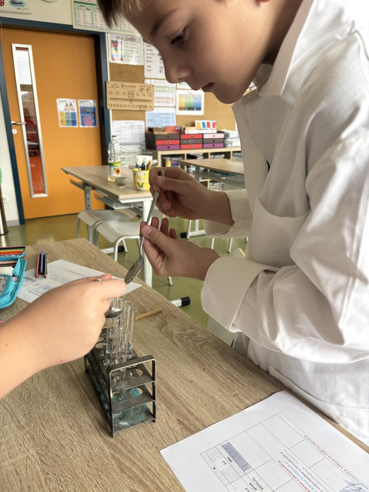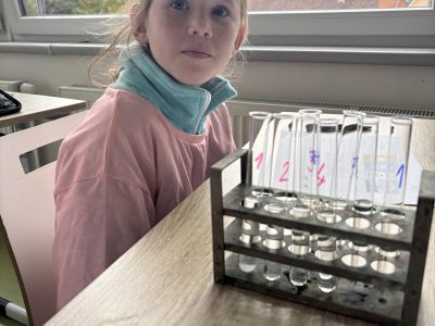 Na přírodovědném kroužku jsme pozorovali vlastnosti látek. Víme, co znamená klesat ke dnu, zůstat na povrchu, rozpouštět se, nerozpouštět se. Uvědomujeme si, že každou chemikálii nabíráme čistou lžičku. Svá pozorování zapisujeme do pracovního listu.