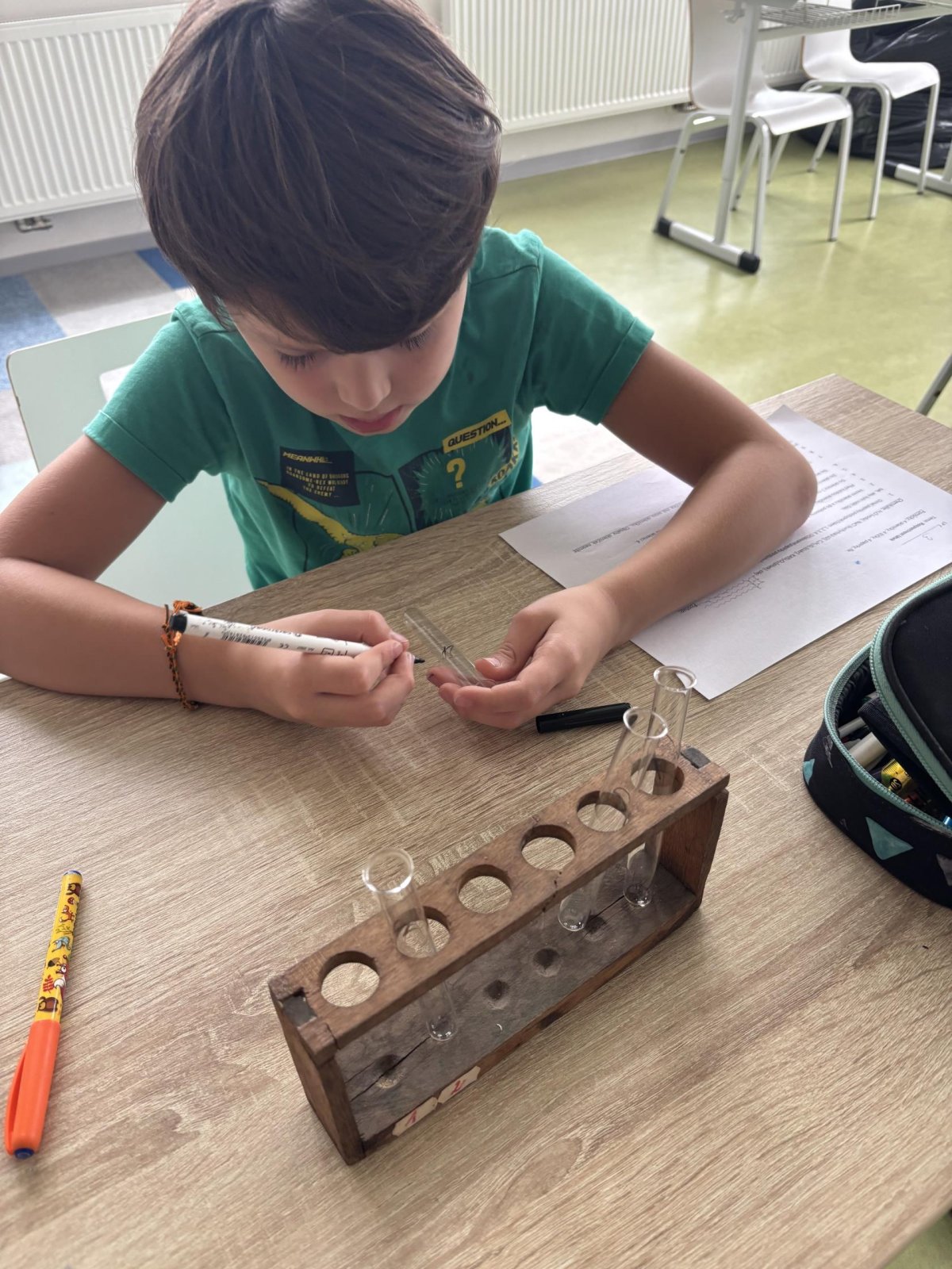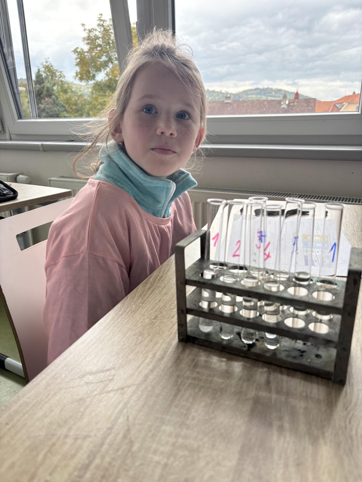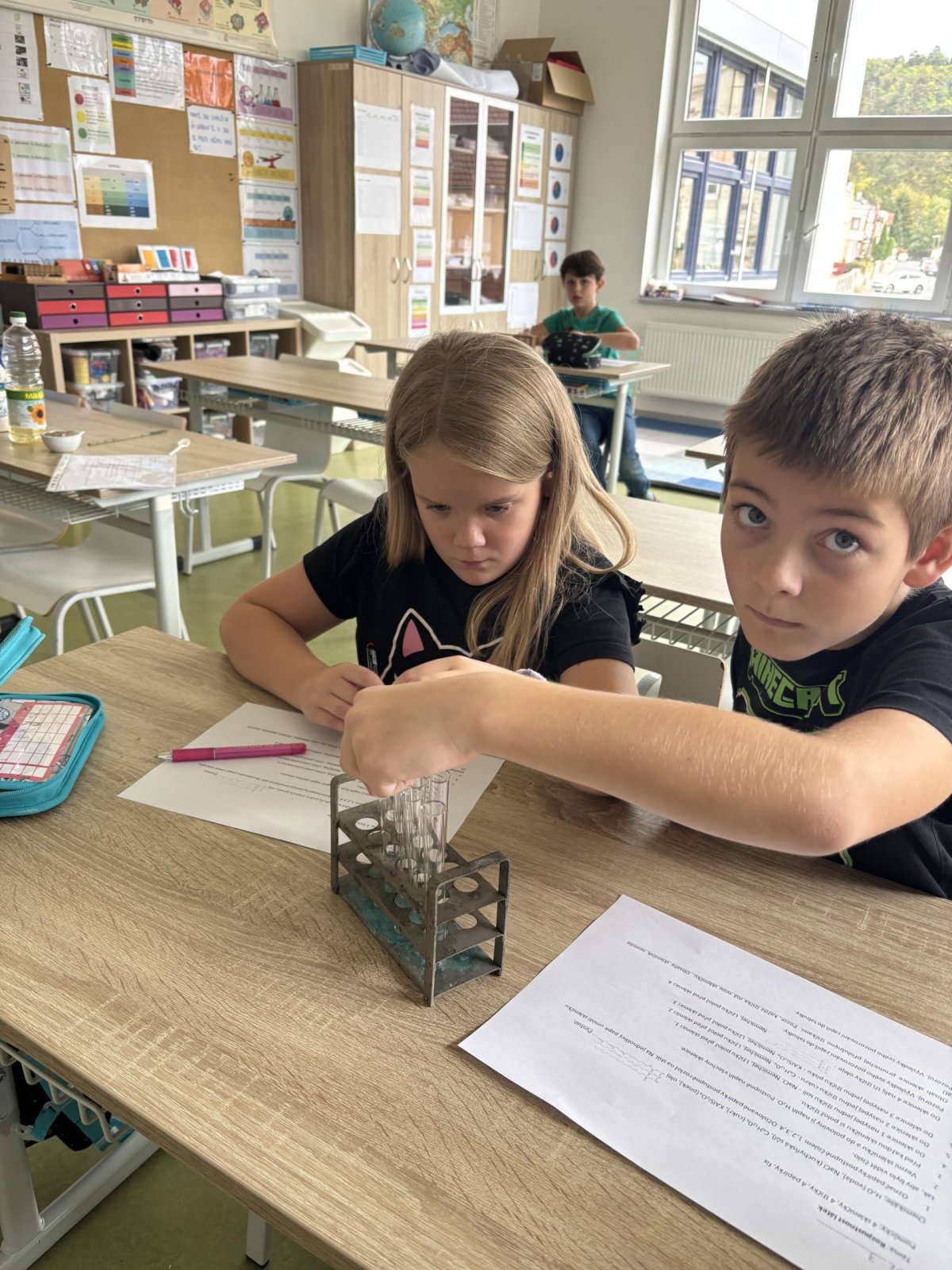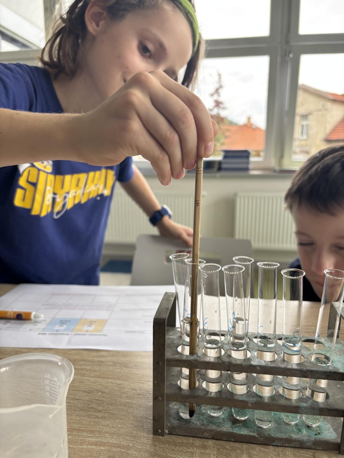 Na přírodovědném kroužku jsme pozorovali vlastnosti látek. Víme, co znamená klesat ke dnu, zůstat na povrchu, rozpouštět se, nerozpouštět se. Uvědomujeme si, že každou chemikálii nabíráme čistou lžičku. Svá pozorování zapisujeme do pracovního listu.