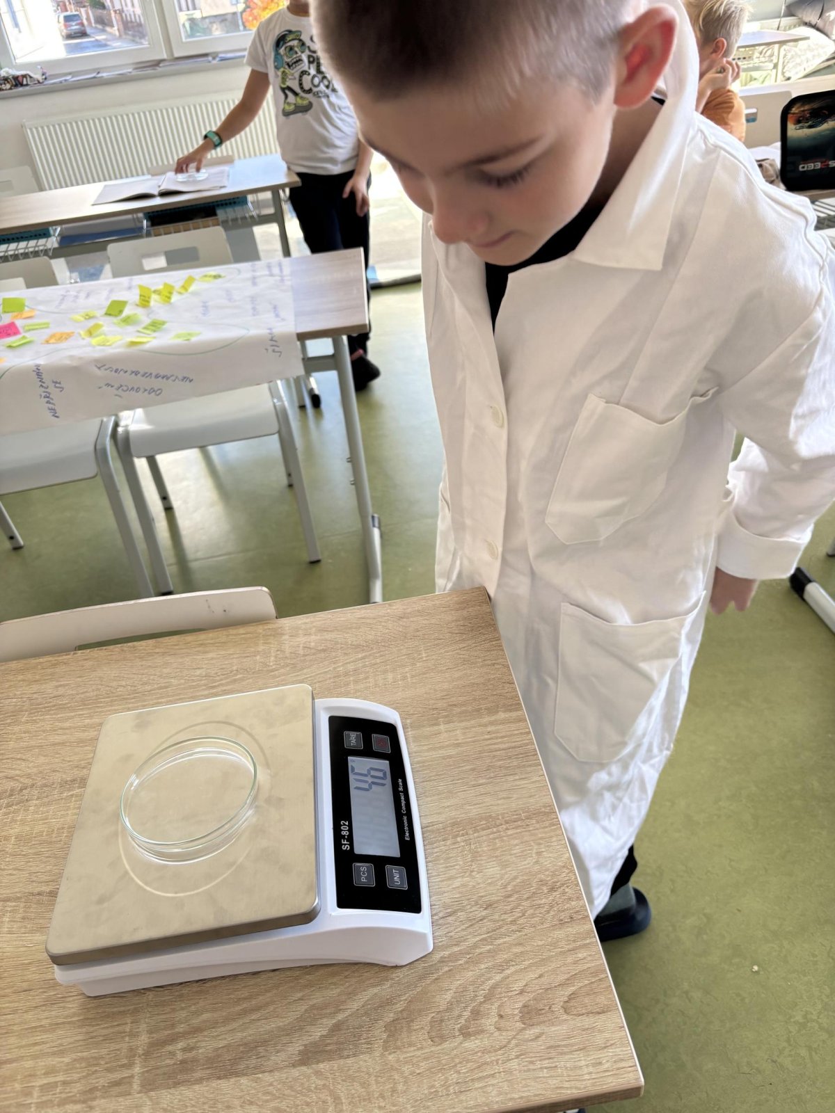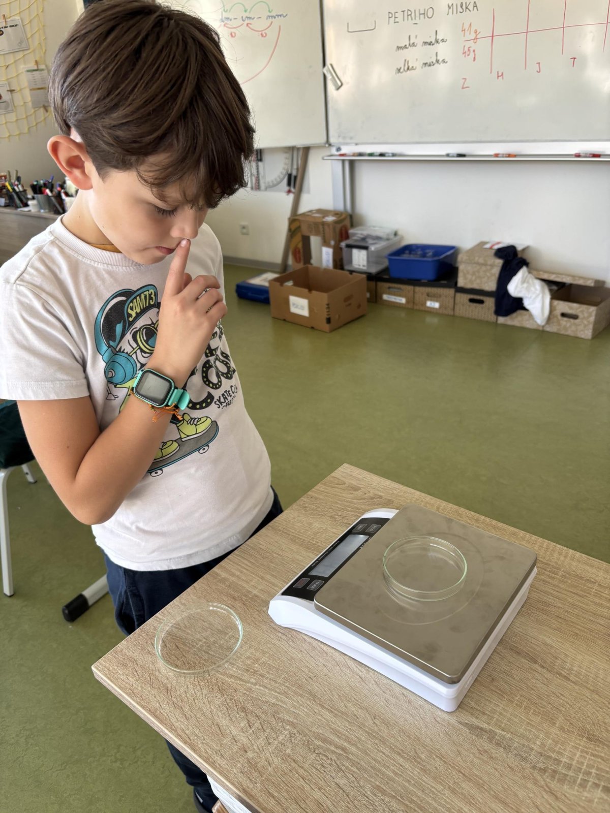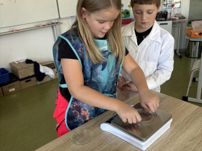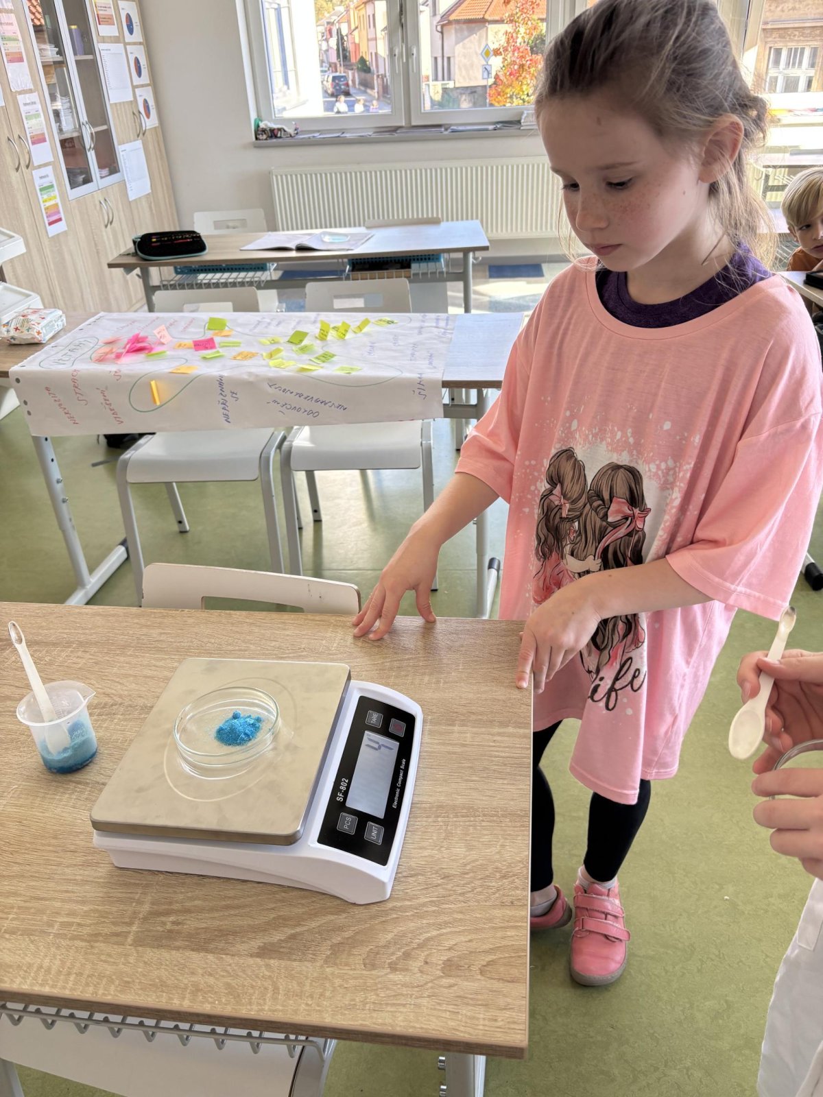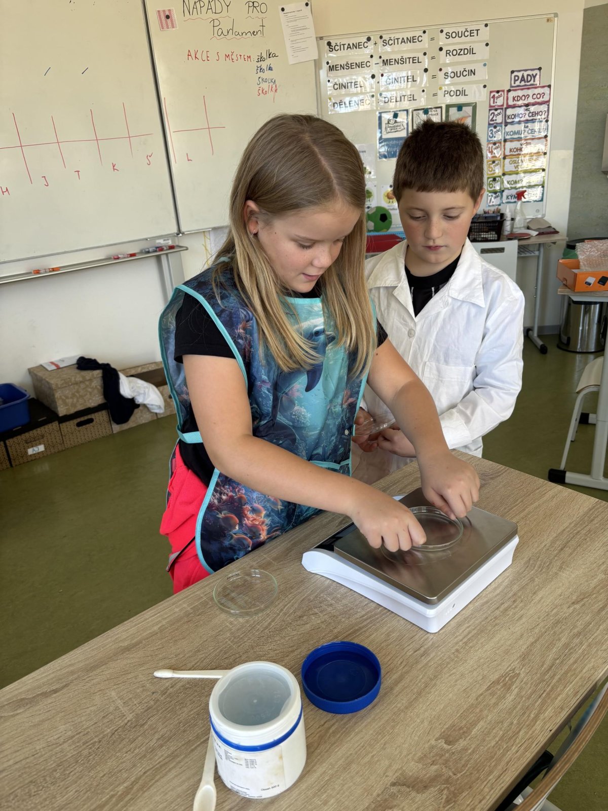 Na přírodovědném kroužku jsme pracovali s váhou. Nejprve jsme se naučili, jak správně postupovat při vážení. Následně jsme zkoušeli odhadnout, kolik g váží materiál. Seznámili jsme se s chemickým nádobím - Petriho miskou. Nakonec jsme odvažovali jednu lžičku skalice modré a následně vytvořili roztok. Zformulovali jsme hypotézu, jak bude vypadat Petriho miska za týden. Na příštím přírodovědném kroužku navrhovanou hypotézu potvrdíme či vyvrátíme.