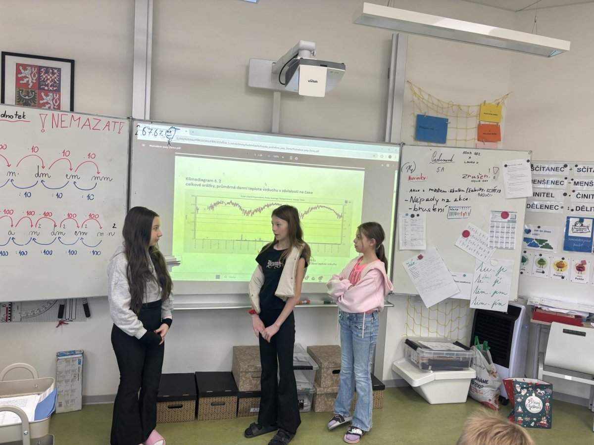 Protože už všechno víme o biomech, můžeme shrnovat a porovnávat jejich klima. Víme, jaké faktory je ovlivňují. Při badatelské hodině jsme zjišťovali informace na výzkumnou otázku: Jaký klimadiagram odpovídá vybraným oblastem (Thajsko, Saudská Arábie, ČR, Nový Zeland, Finsko). Nejprve jsme zjistili, co všechno klimadiagramy obsahují (teploty, srážky) a vyčetli jsme informace, které zobrazoval. Následně jsme odhadli, které klimadiagramy k oblastem patří. Potom jsme své odhady ověřili v mapě a pomocí PC. Nakonec jsme zjištěné informace prezentovali ostatním spolužákům.