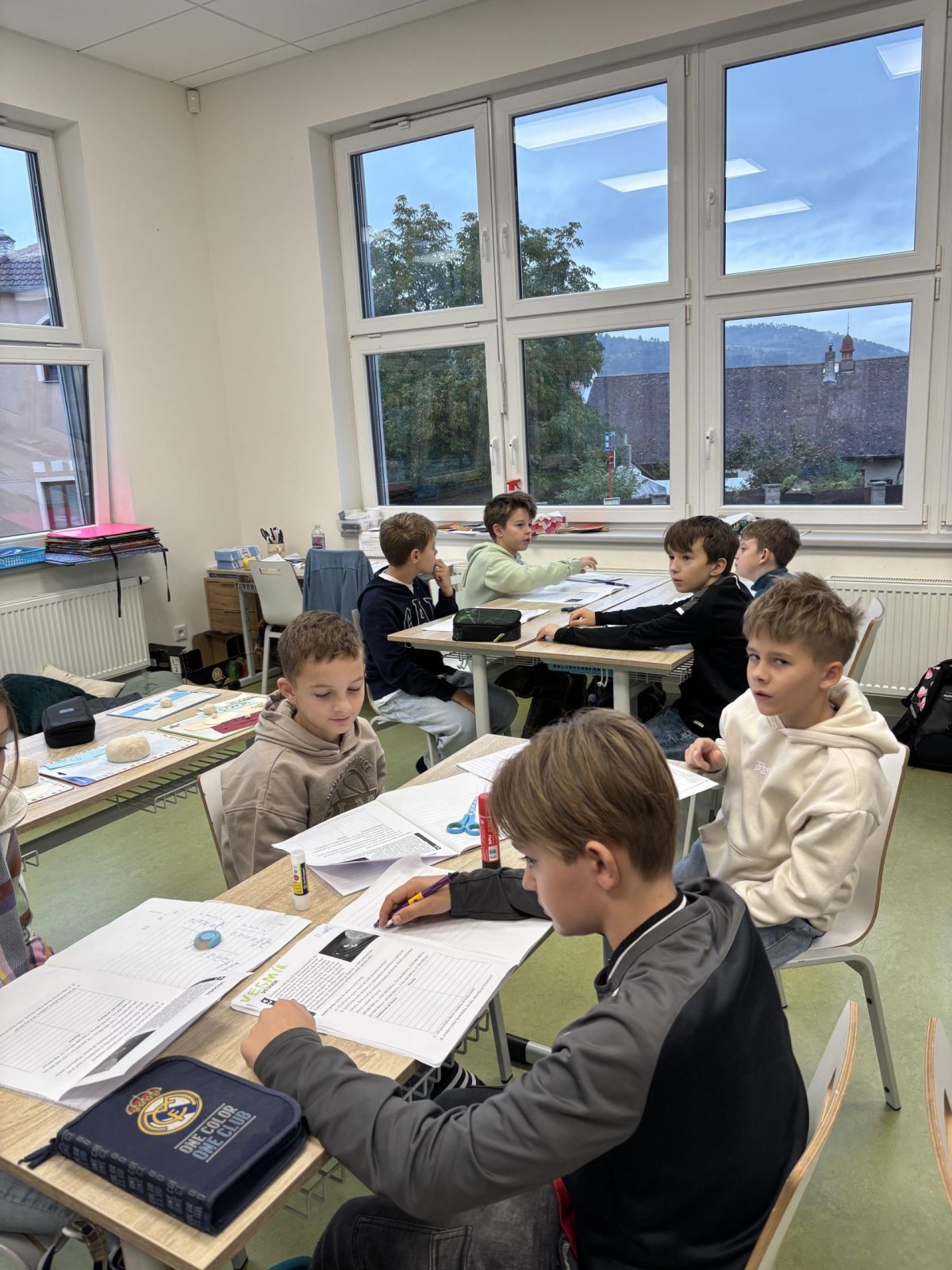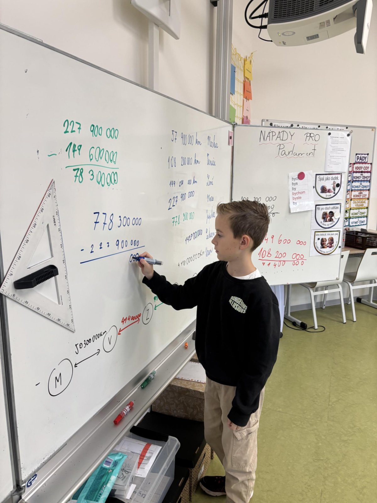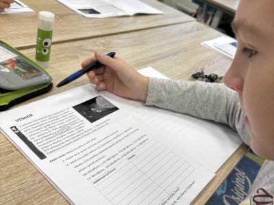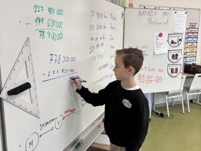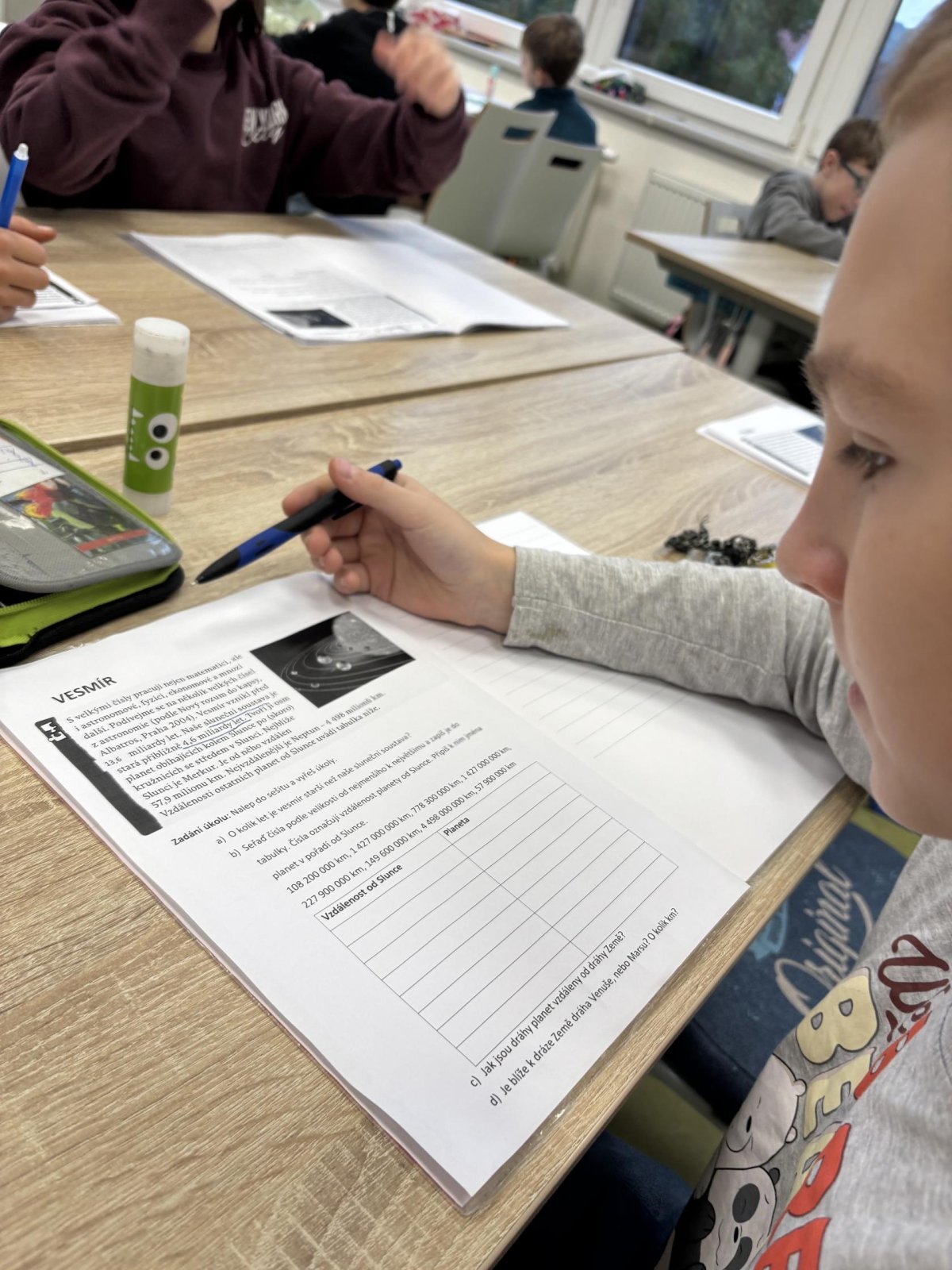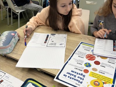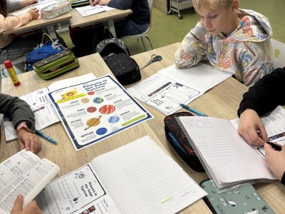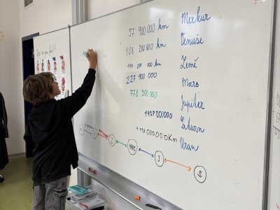 Tento školní rok začínáme kooperativní výuku 5. ročníků projektem o vesmíru. Vytvořili jsme heterogenní skupiny napříč třídami. Po dobu tří vyučovacích hodin jsme procházeli čtyřmi stanovišti. Na prvním stanovišti jsme se věnovali popisu planety, na druhém jsme pracovali se vzdálenostmi planet od Slunce, na třetím stanovišti jsme informace o planetách zpracovávali v AJ a na čtvrtém stanovišti jsme planety (z těsta) rozmístili na orbity Sluneční soustavy a porovnávali jejich velikost.
