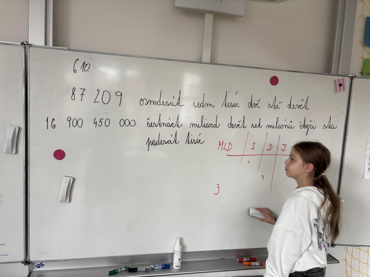 V hodinách MAT pracujeme s velkými čísly. Uvědomujeme si jednotlivé řády, čísla čteme, zapisujeme a přiřazujeme na číselnou osu.