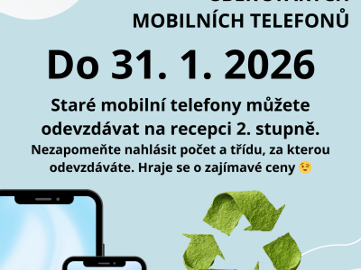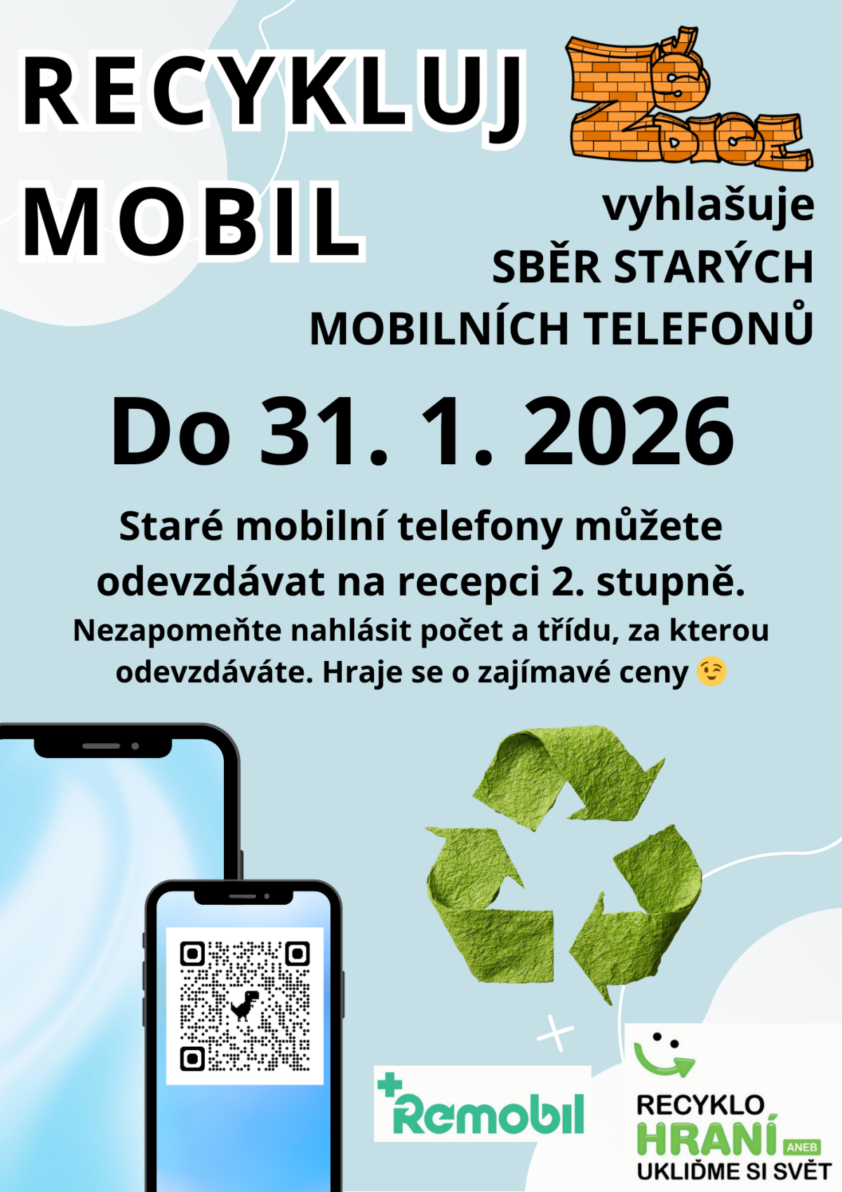 Akce je součástí projektu Recyklohraní, do kterého je naše škola zapojena. Staré mobilní telefony můžete odevzdávat do konce ledna 2026 na recepci 2. stupně. Nezapomeňte nahlásit počet a za jakou třídu odevzdáváte. Hraje se o zajímavé ceny!