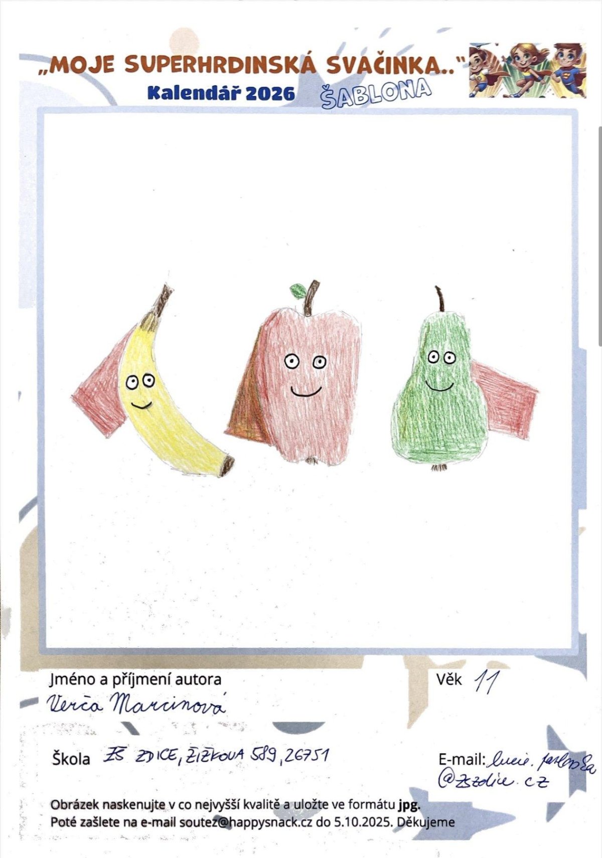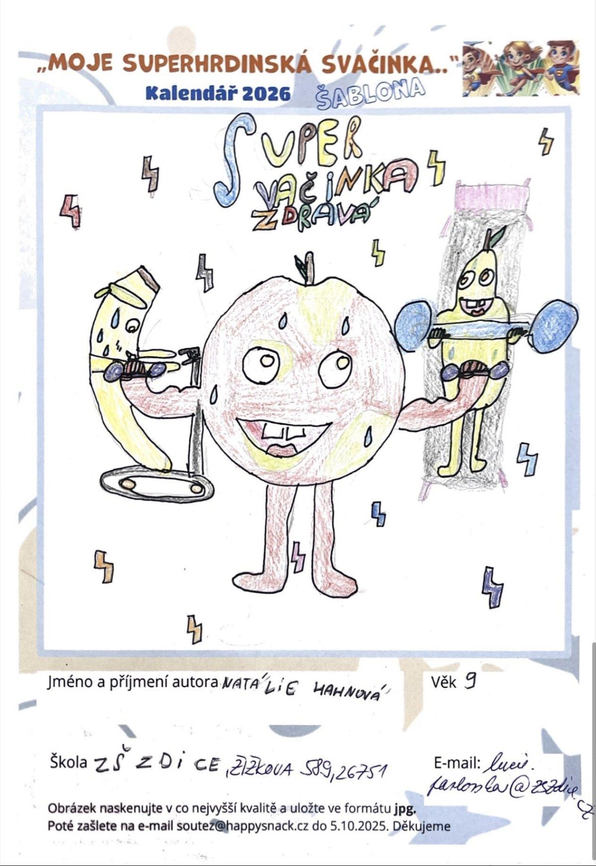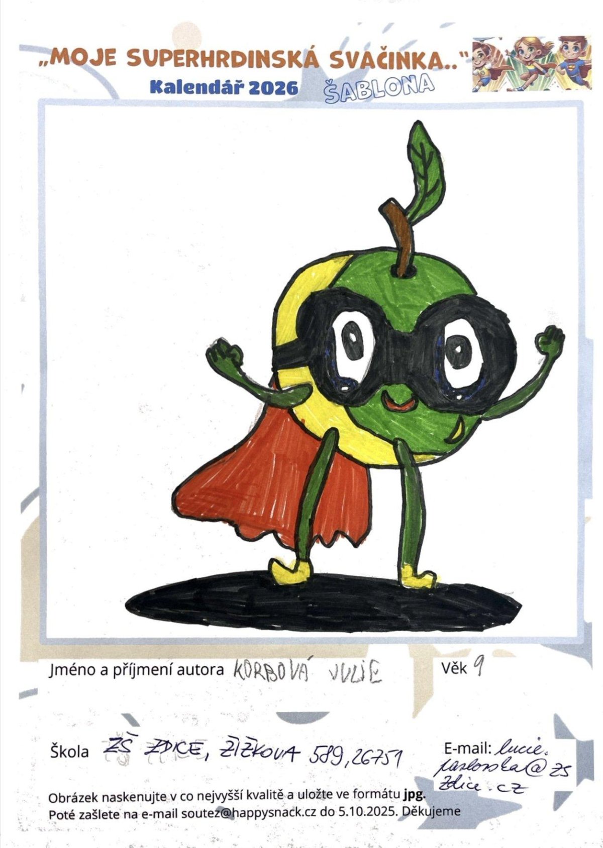 Náš školní klub se v letošním roce zapojil do výtvarné soutěže „Kalendář Happysnack 2026“ s mottem „Moje superhrdinská svačinka“. Úkolem dětí je nakreslit či namalovat obrázek své oblíbené zdravé svačinky, která se promění v superhrdinu s nadpřirozenými schopnostmi.