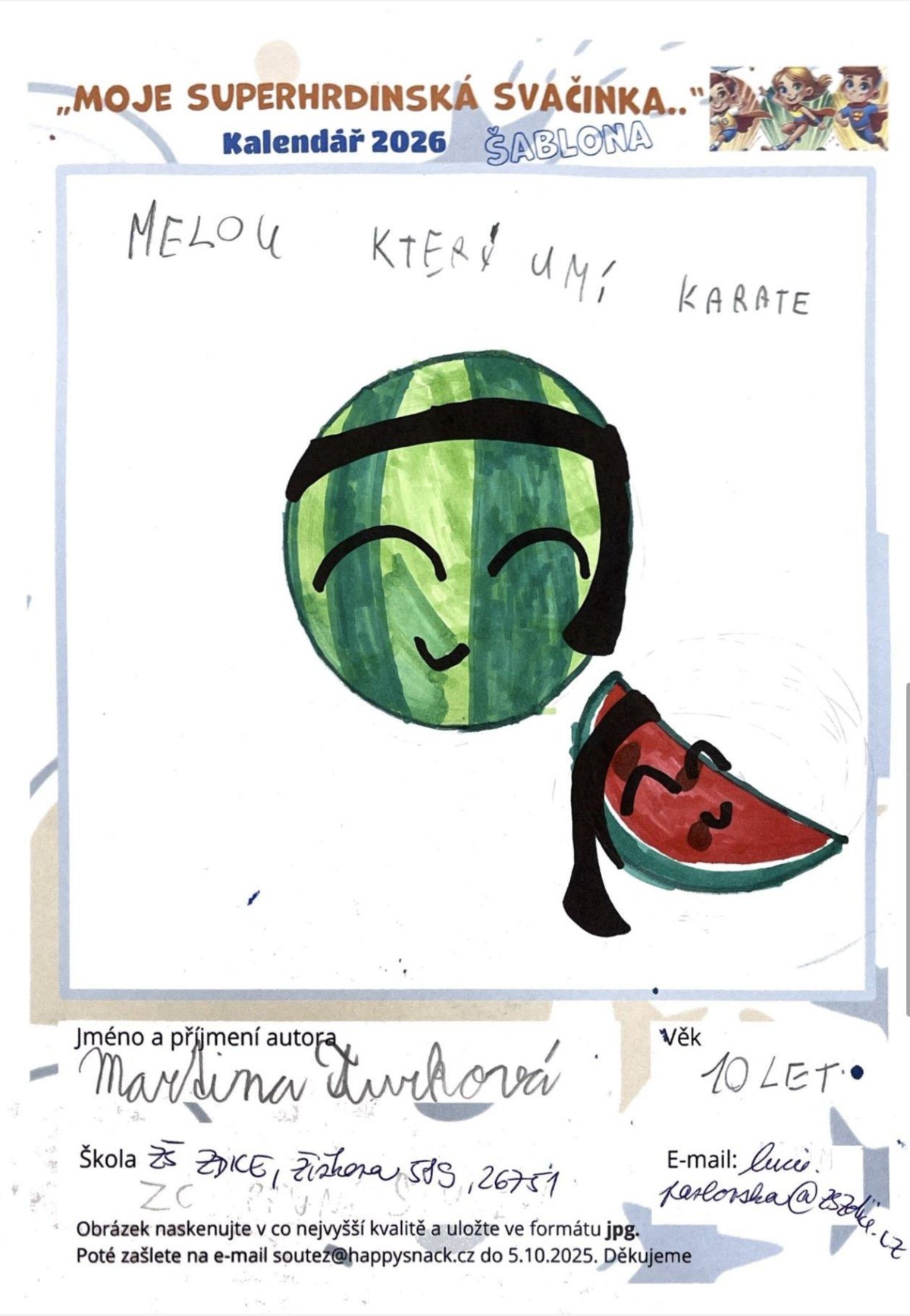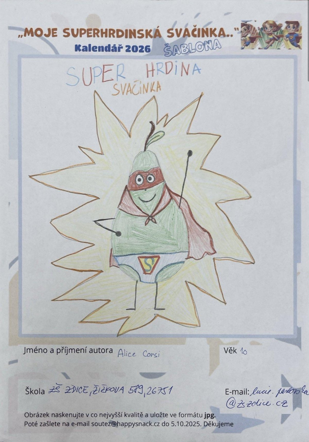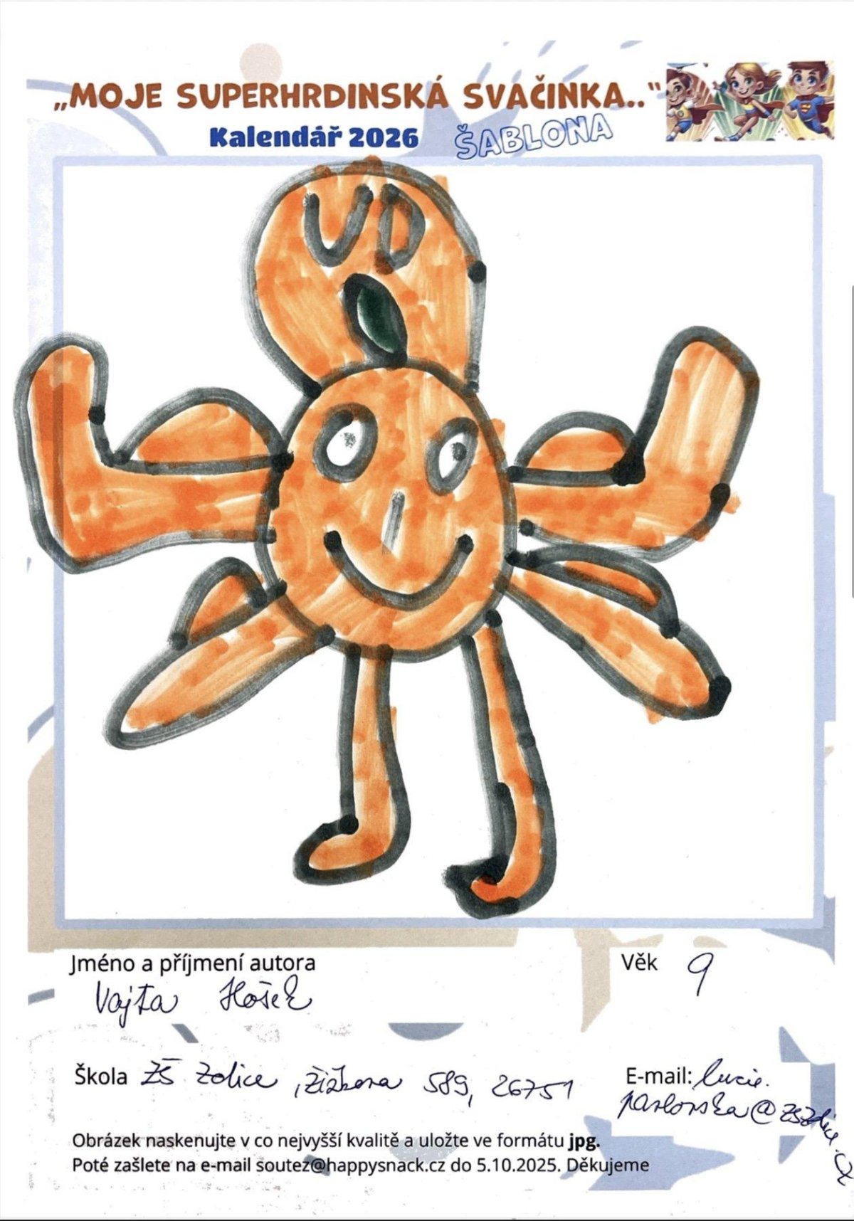 Náš školní klub se v letošním roce zapojil do výtvarné soutěže „Kalendář Happysnack 2026“ s mottem „Moje superhrdinská svačinka“. Úkolem dětí je nakreslit či namalovat obrázek své oblíbené zdravé svačinky, která se promění v superhrdinu s nadpřirozenými schopnostmi.