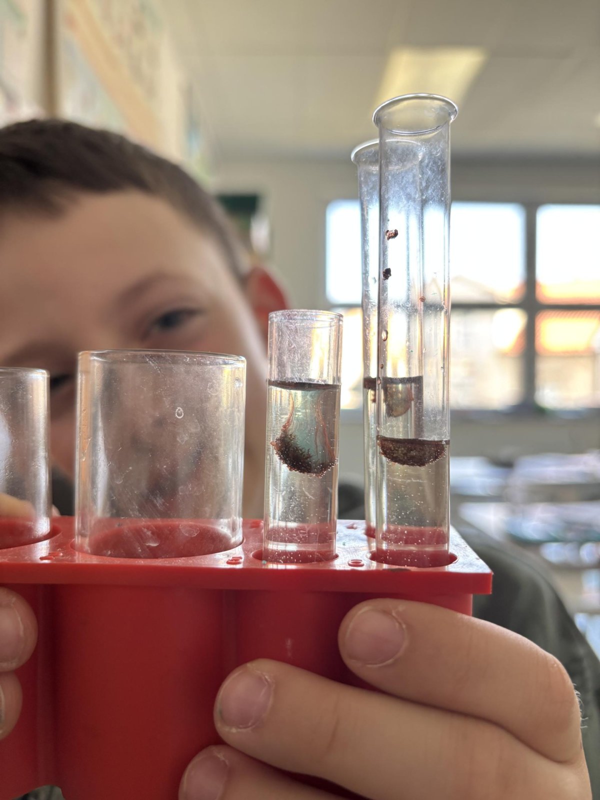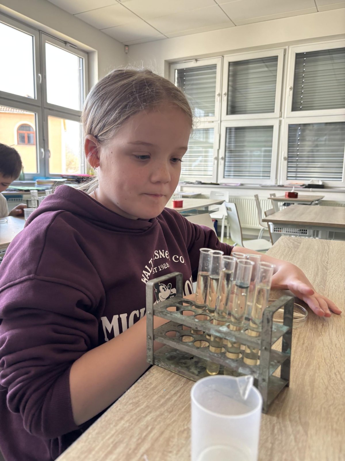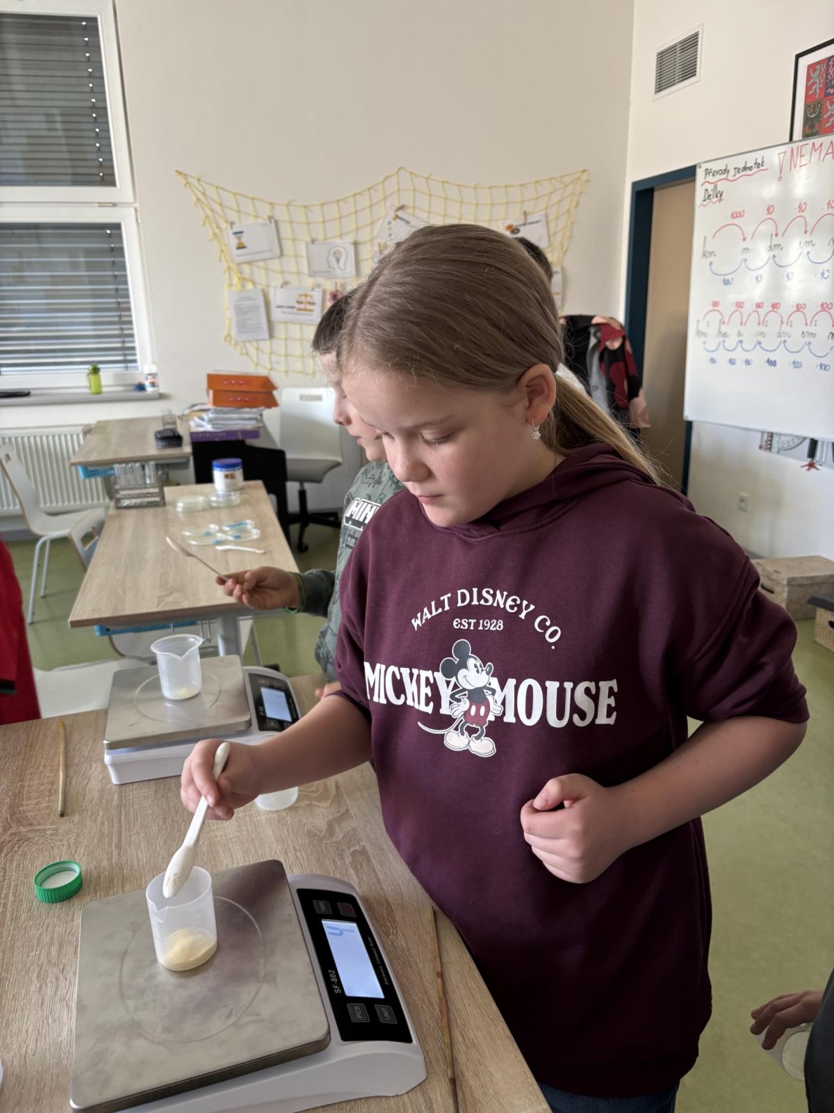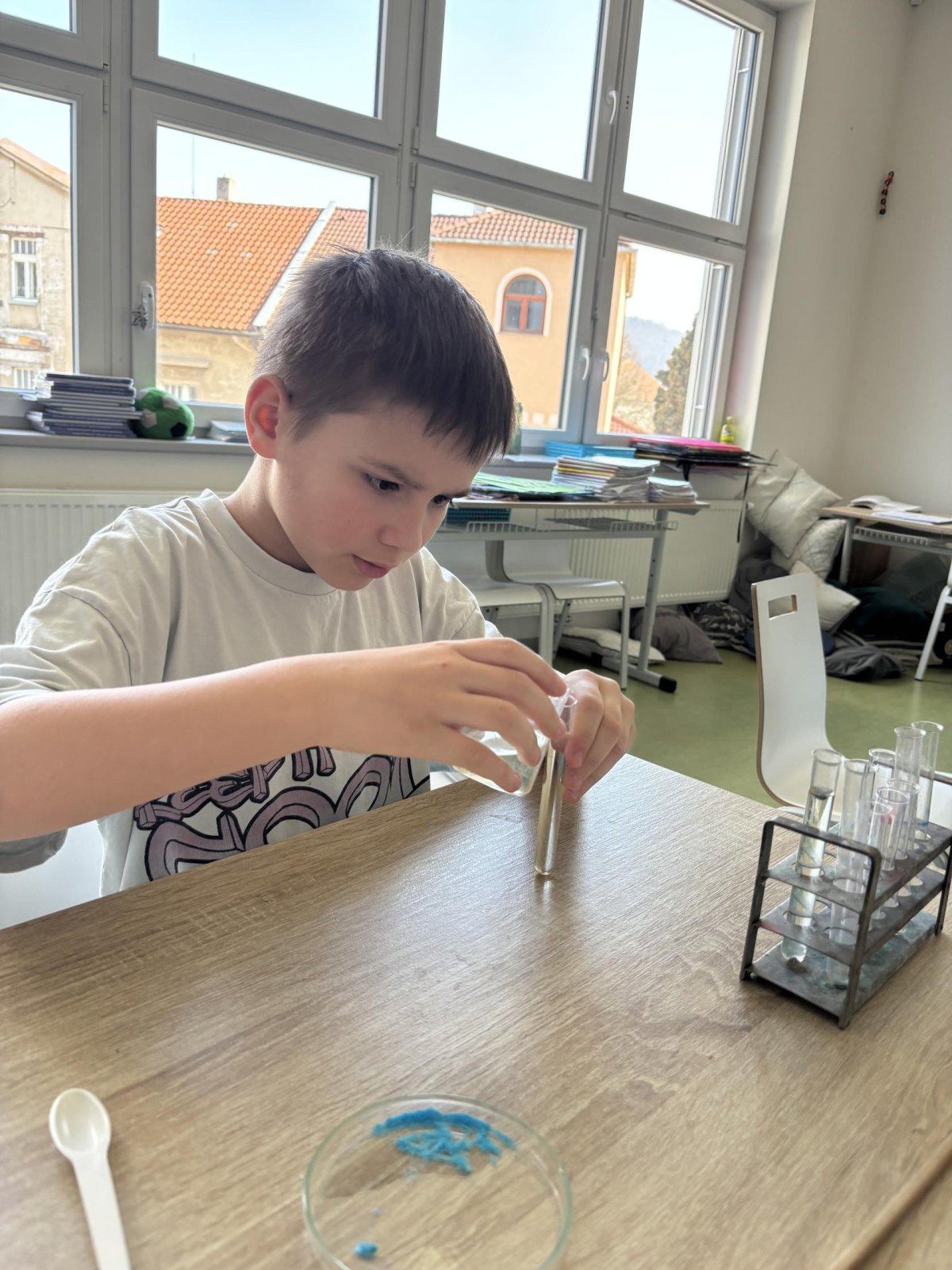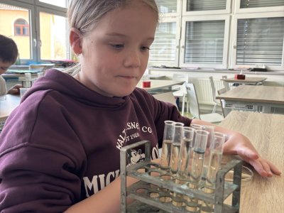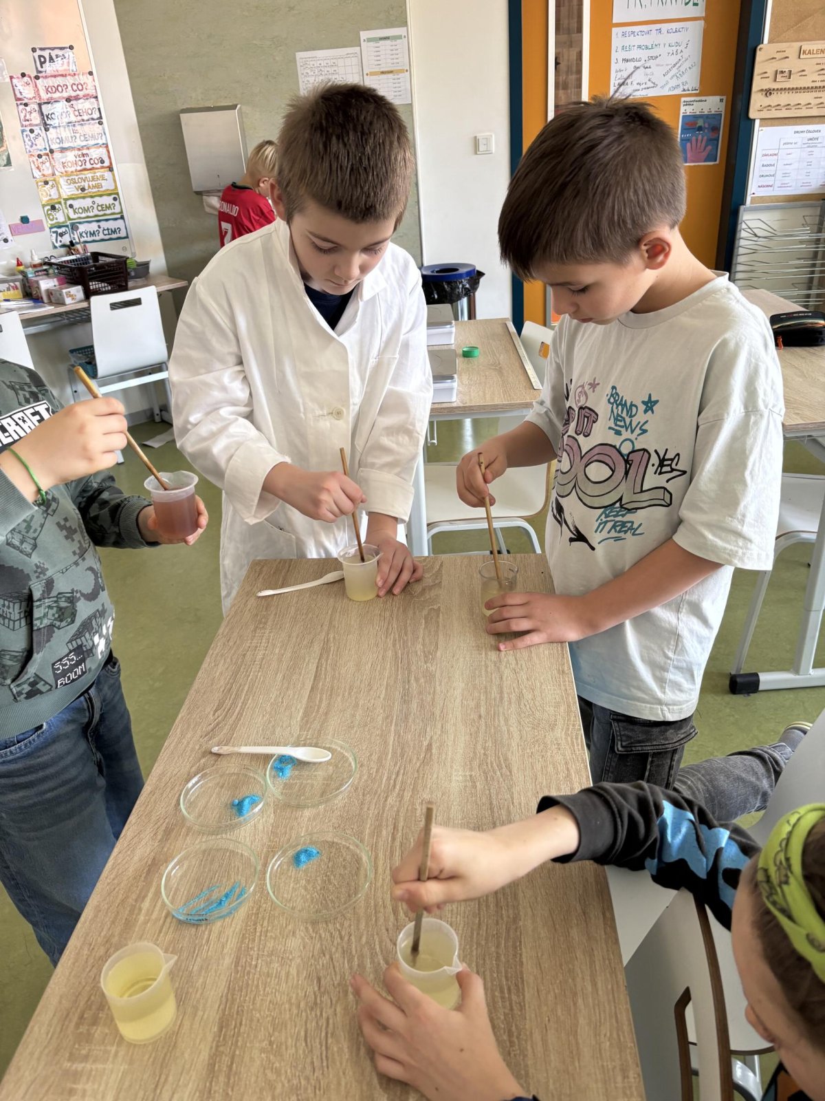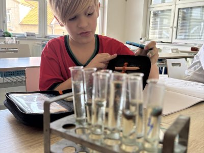 Příprava roztoků: Žáci si sami navážili chemické látky a vytvořili 5% roztoky.