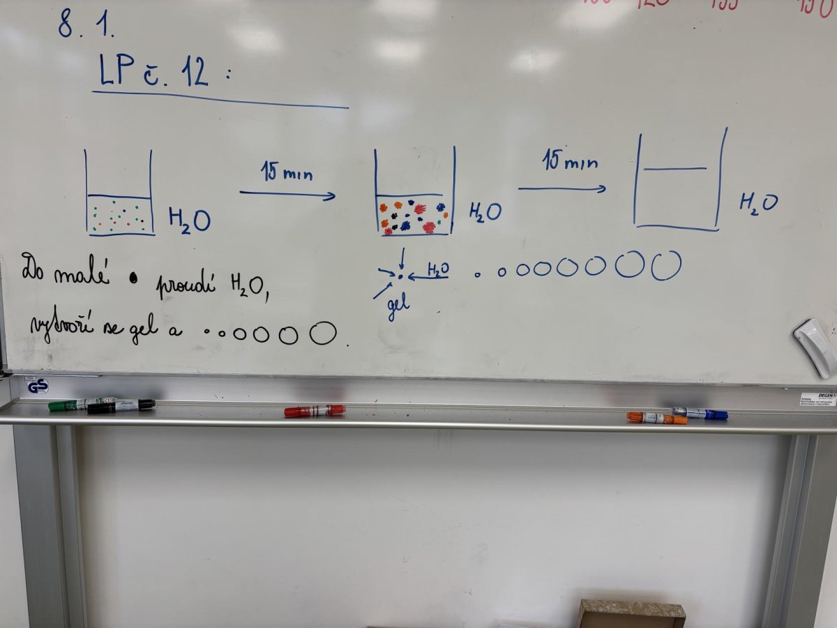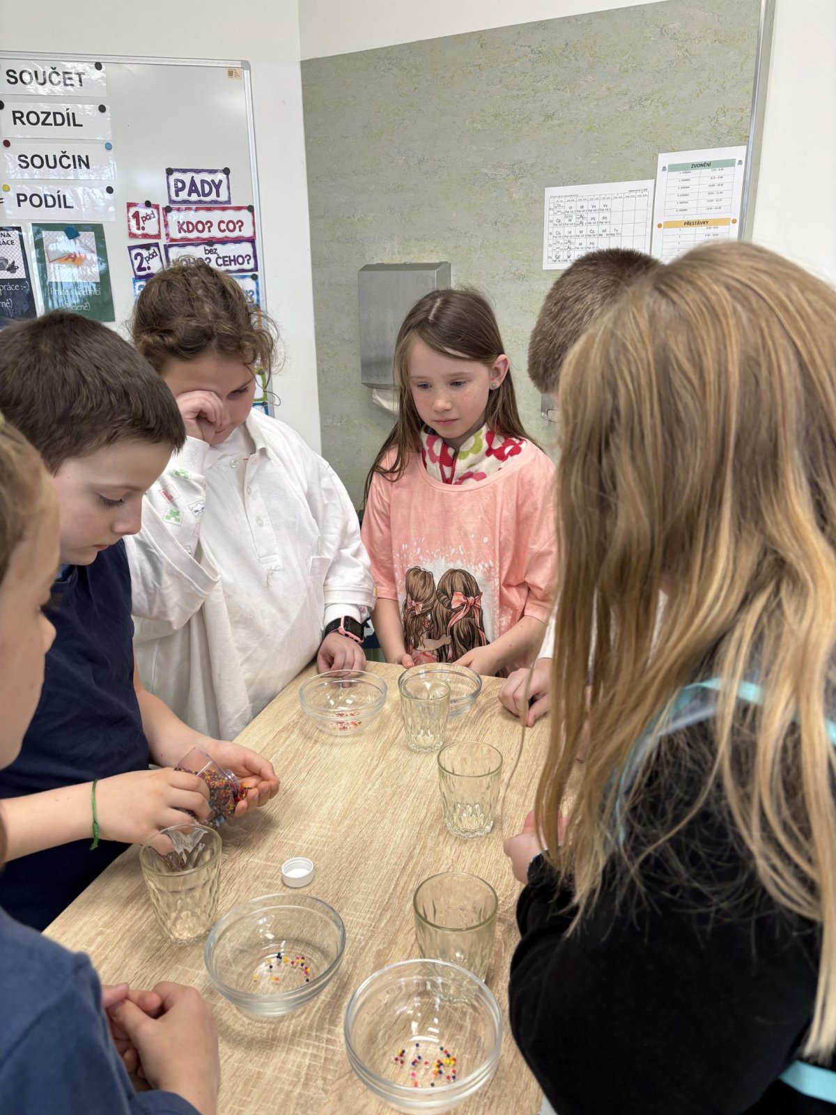 Badatelé napjatě sledovali, jak malé gelové kuličky pomalu vsakují vodu a zvětšují se před jejich očima. S každým okamžikem kuličky narůstaly a měnily svůj objem, až byly téměř dvojnásobné. Žáci pečlivě zapisovali své poznatky. Nakonec vysvětlili, že voda postupně proniká do kuliček a udržuje se v jejich gelové síti, což způsobuje jejich zvětšení.