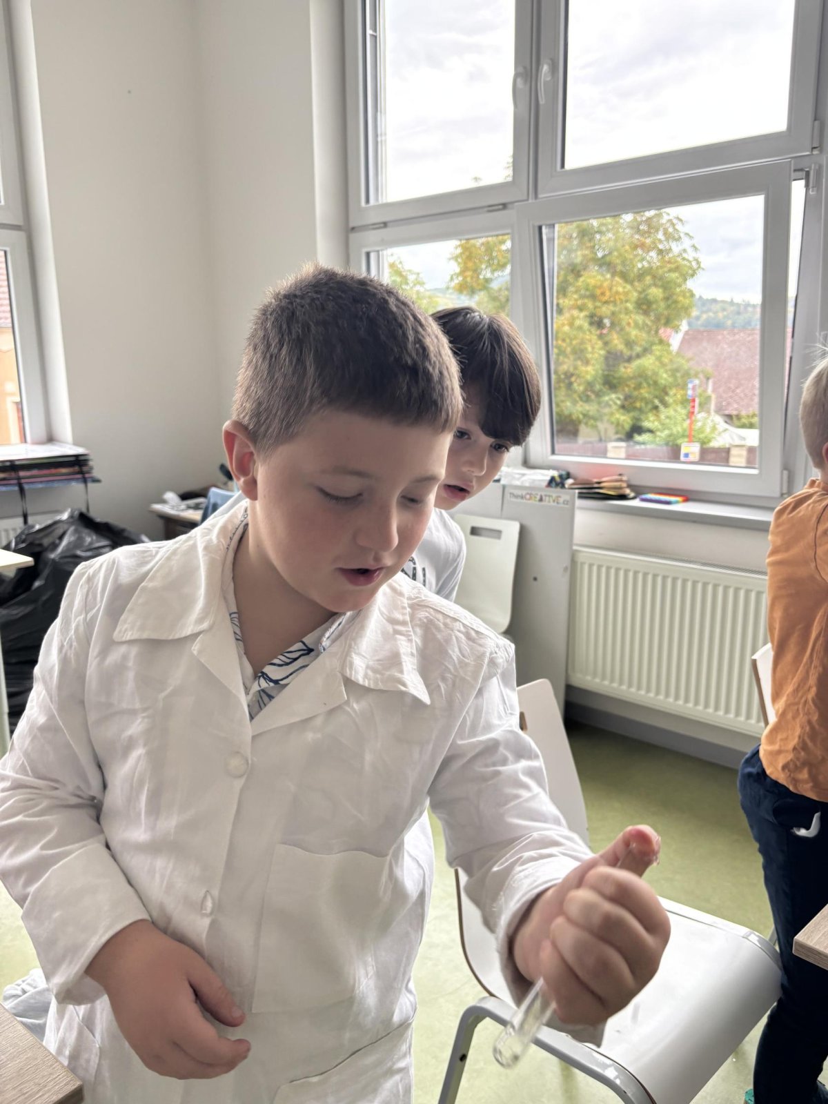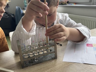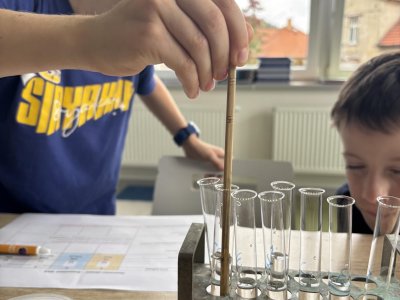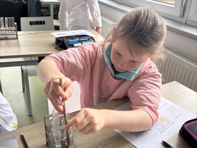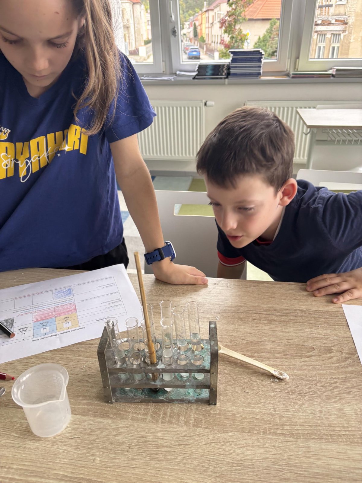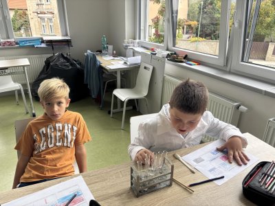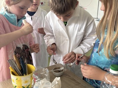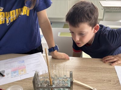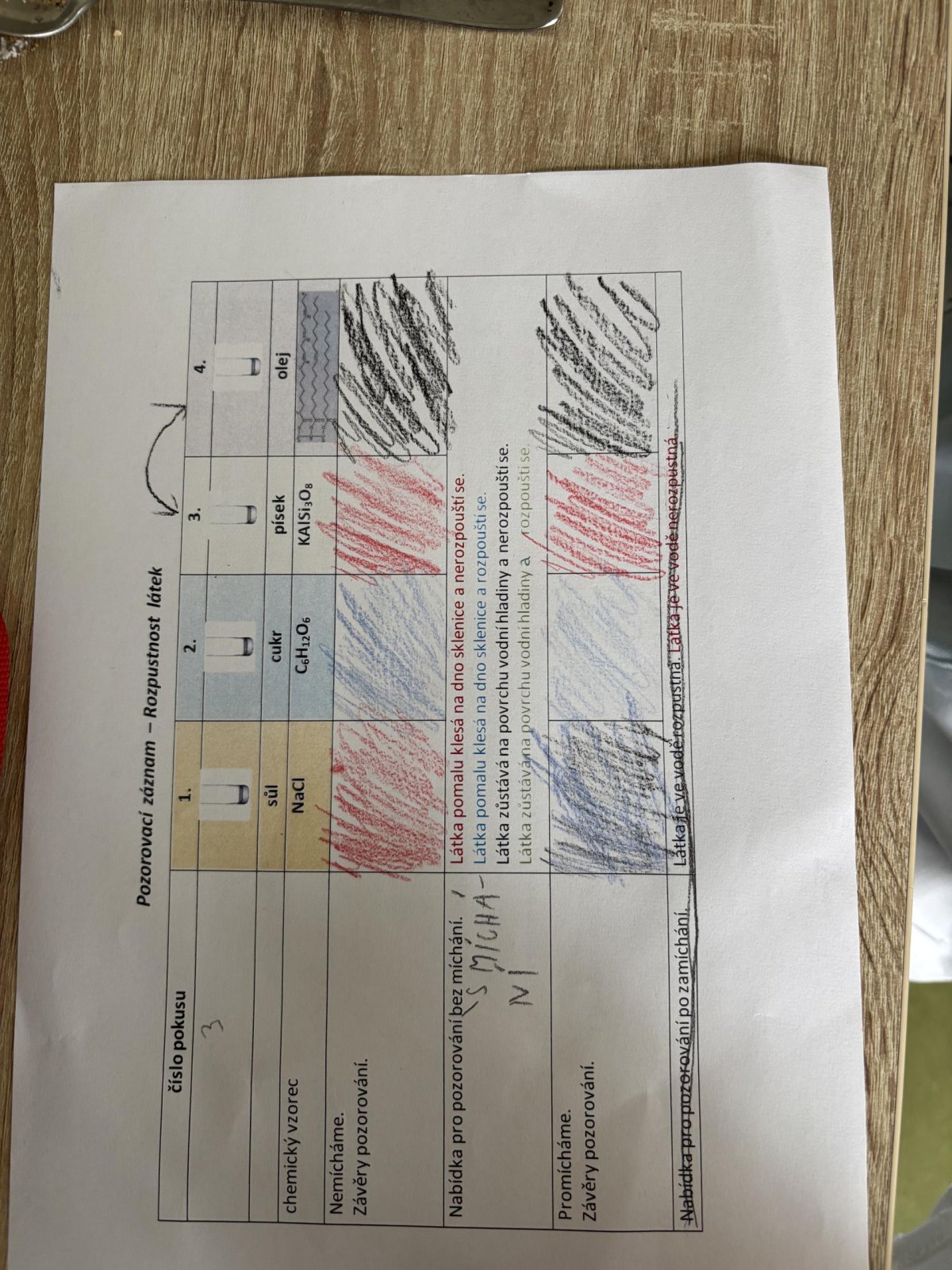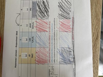 Na přírodovědném kroužku jsme pozorovali vlastnosti látek. Víme, co znamená klesat ke dnu, zůstat na povrchu, rozpouštět se, nerozpouštět se. Uvědomujeme si, že každou chemikálii nabíráme čistou lžičku. Svá pozorování zapisujeme do pracovního listu.