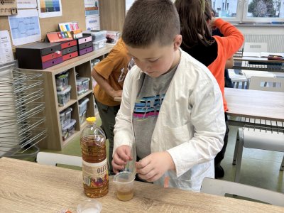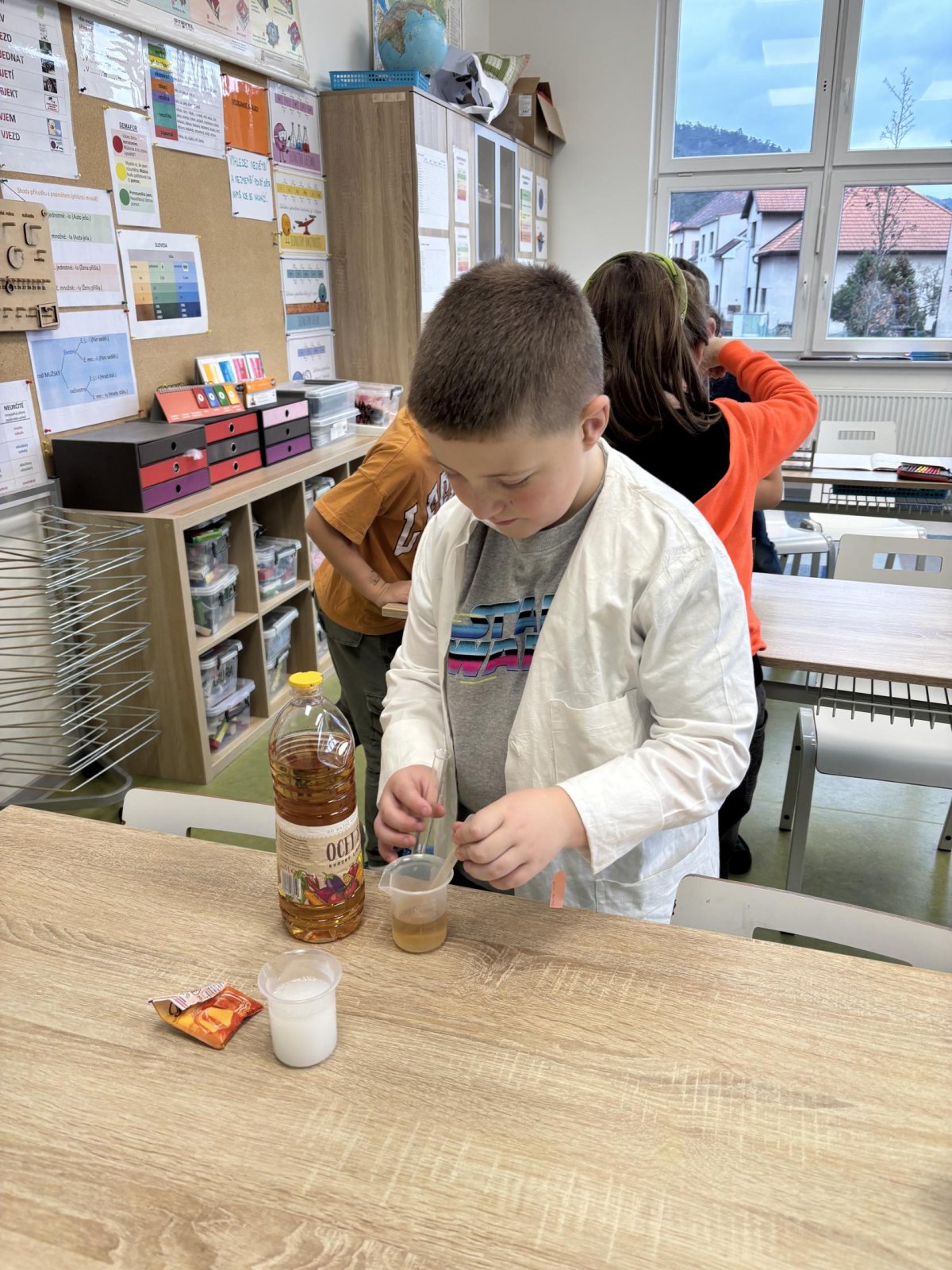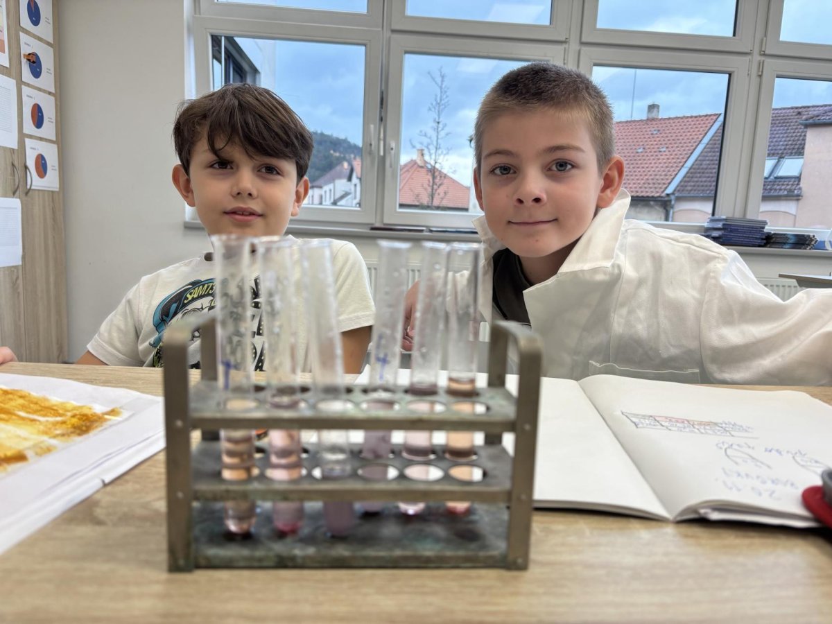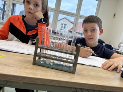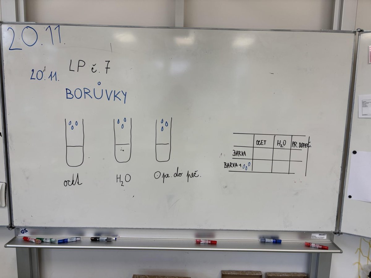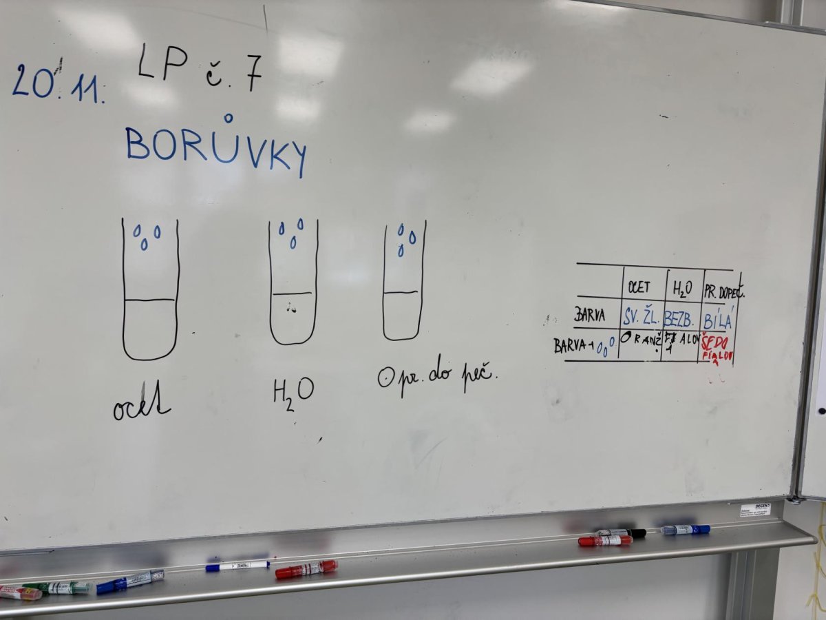 Na přírodovědném kroužku jsme pozorovali, jak se proměňuje barva barviva borůvek v jednotlivých prostředích (ocet, voda, roztok prášku do pečiva). Zjistili jsme, že fialová barva se v kyselém prostředí promění v oranžovou a v zásaditém prostředí ve vínovou. Svá pozorování jsme zapsali a zakreslili.