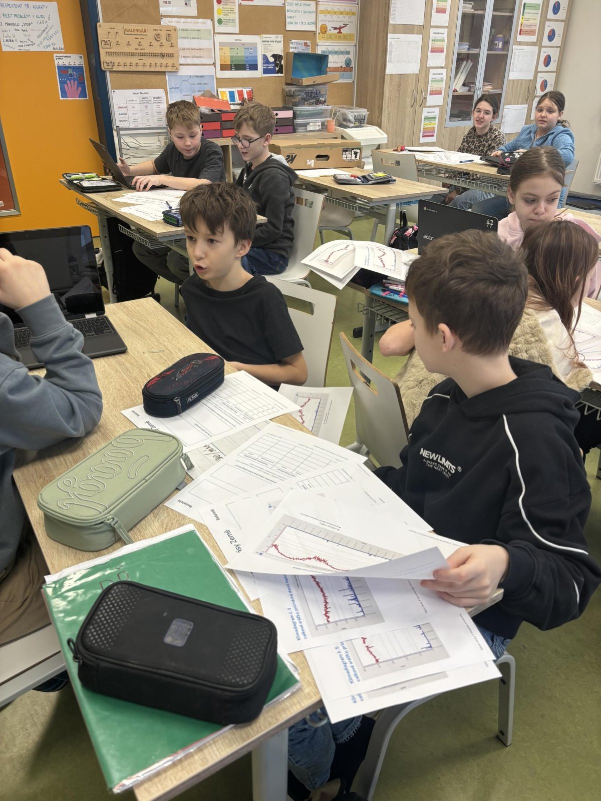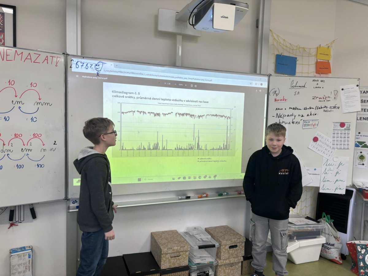 Protože už všechno víme o biomech, můžeme shrnovat a porovnávat jejich klima. Víme, jaké faktory je ovlivňují. Při badatelské hodině jsme zjišťovali informace na výzkumnou otázku: Jaký klimadiagram odpovídá vybraným oblastem (Thajsko, Saudská Arábie, ČR, Nový Zeland, Finsko). Nejprve jsme zjistili, co všechno klimadiagramy obsahují (teploty, srážky) a vyčetli jsme informace, které zobrazoval. Následně jsme odhadli, které klimadiagramy k oblastem patří. Potom jsme své odhady ověřili v mapě a pomocí PC. Nakonec jsme zjištěné informace prezentovali ostatním spolužákům.