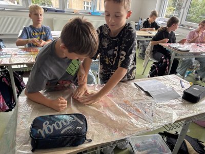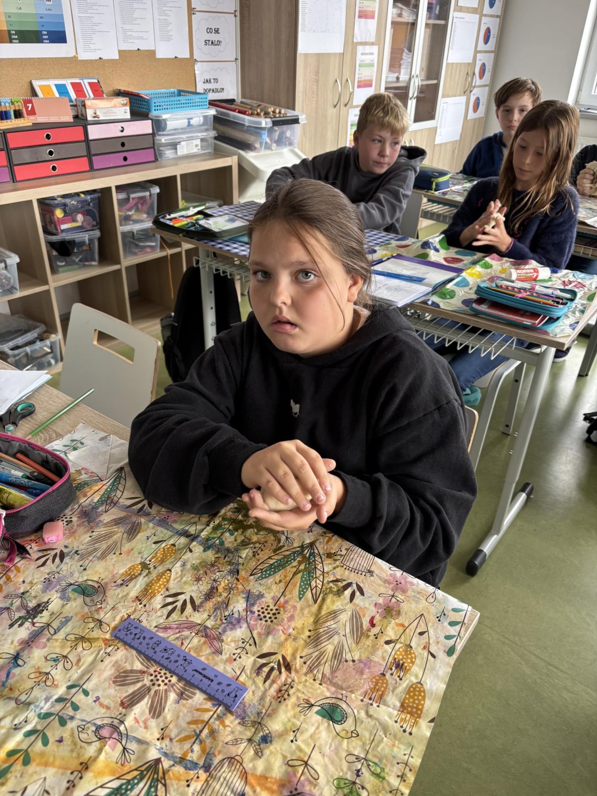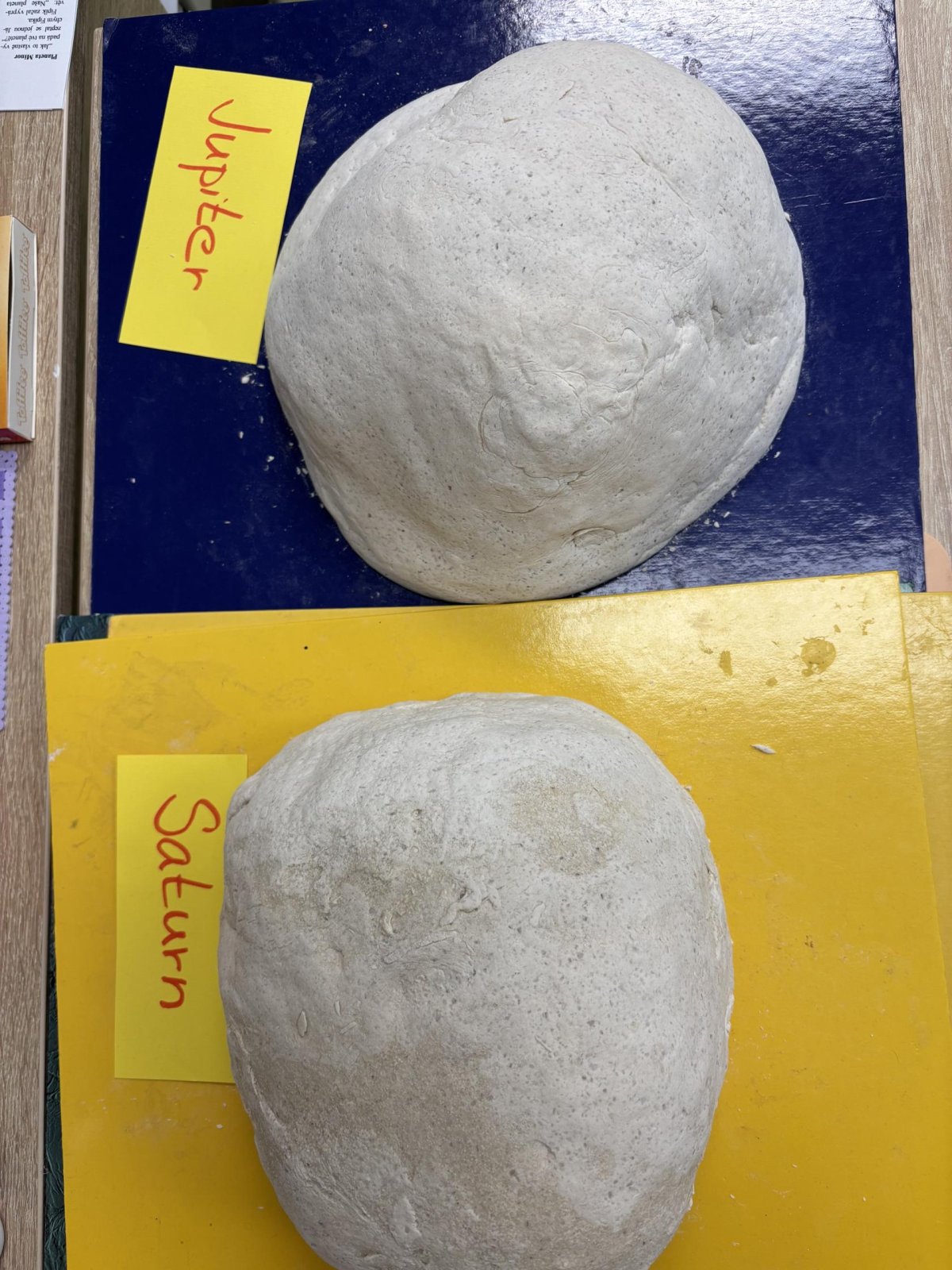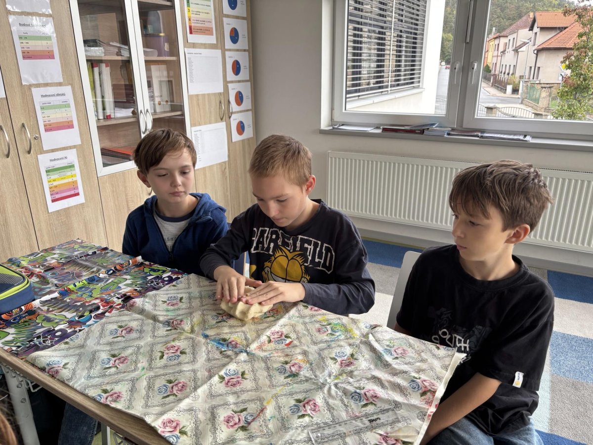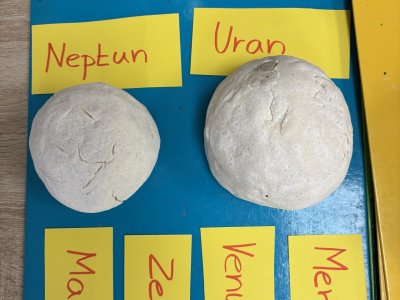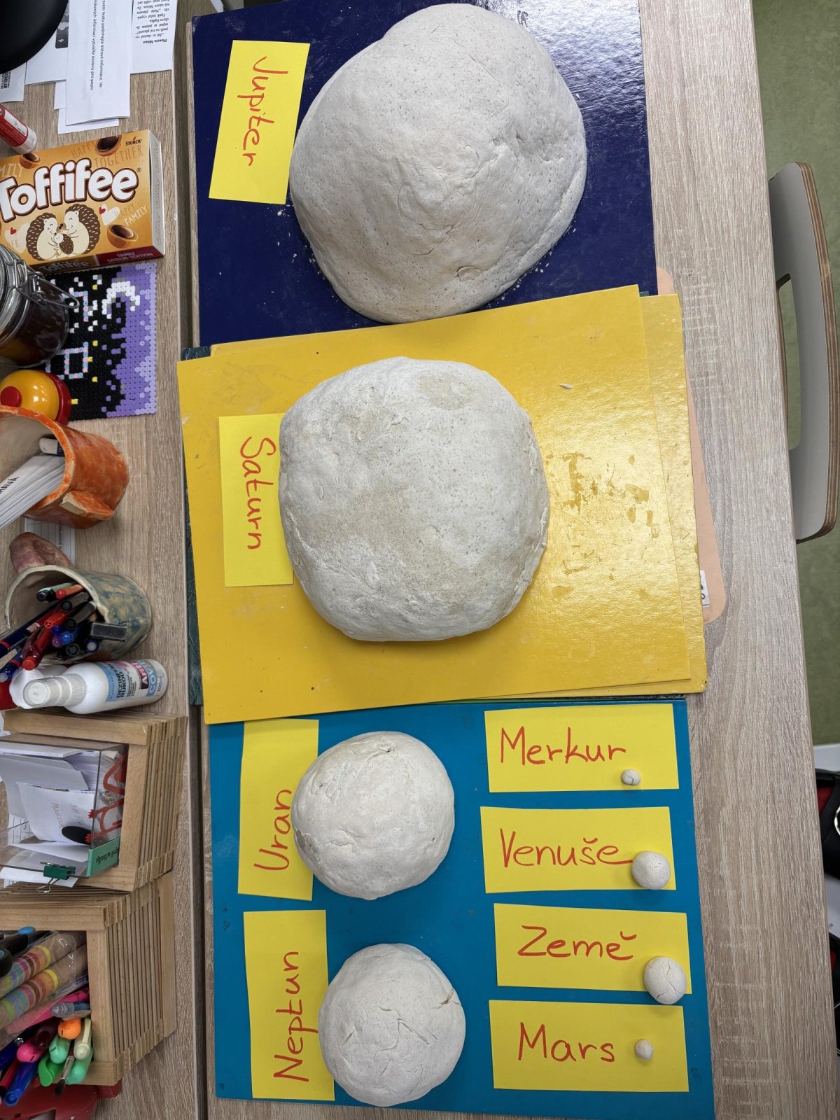 V hodinách výtvarné výchovy jsme vymodelovali planety Sluneční soustavy z těsta. Teprve po jejich vzniku jsme si uvědomovali jejich velikost vůči Slunci. Planety jsme umístili na pomyslné orbity dle pořadí a porovnávali jejich velikost.
