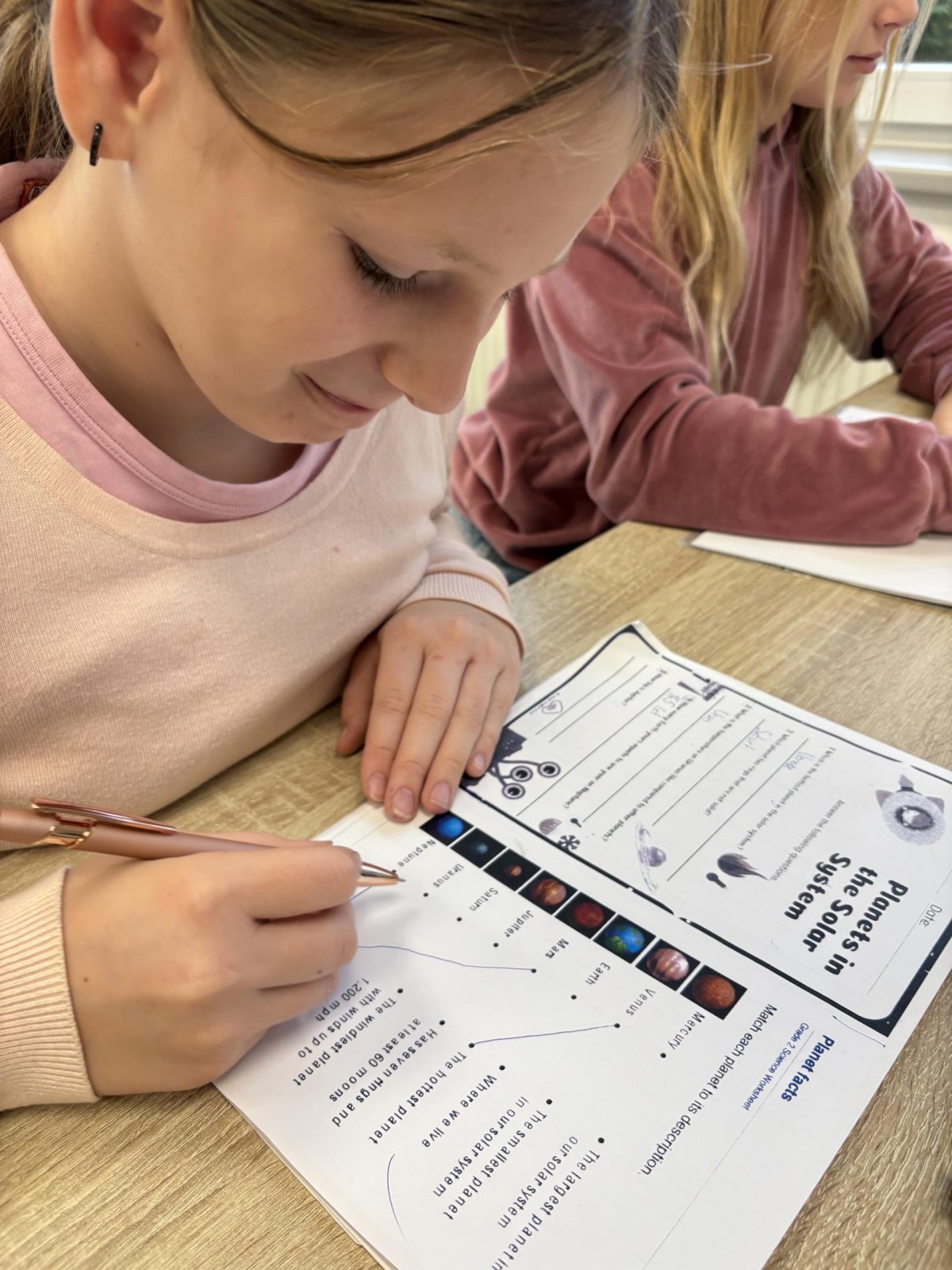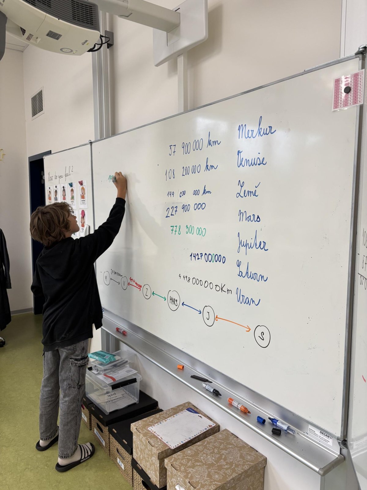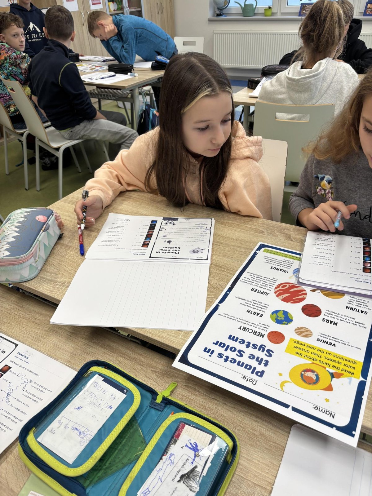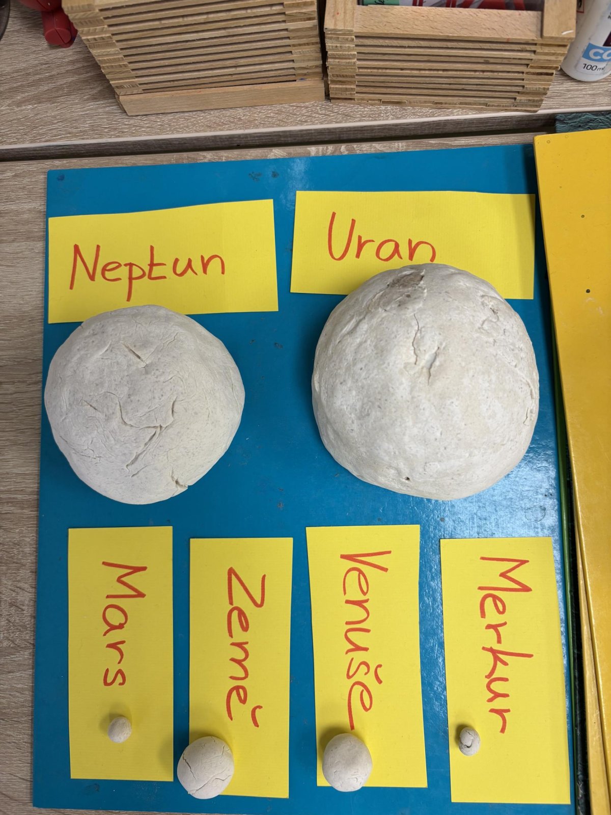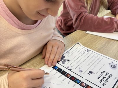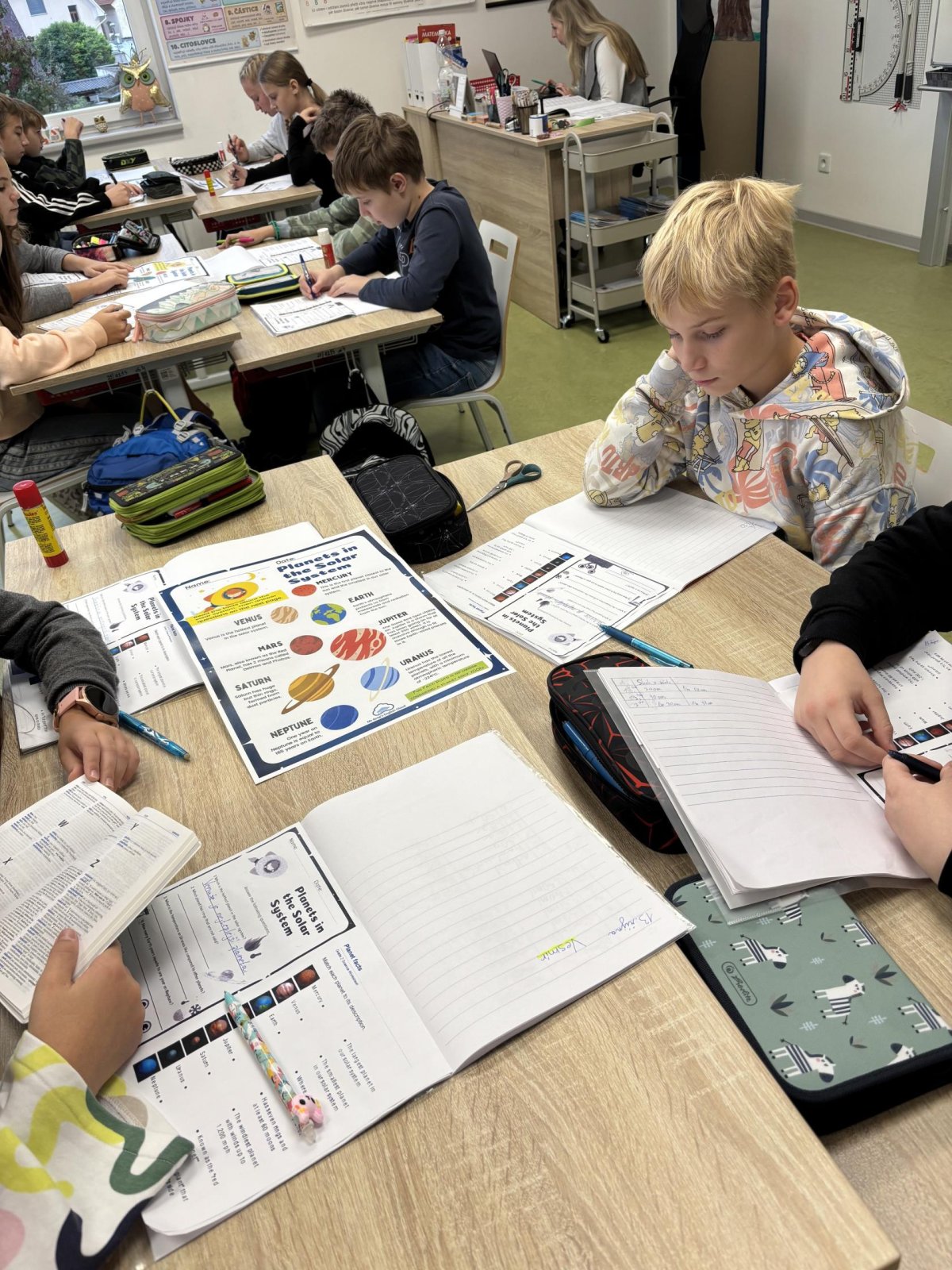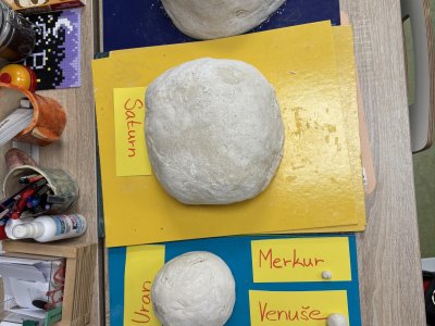 Tento školní rok začínáme kooperativní výuku 5. ročníků projektem o vesmíru. Vytvořili jsme heterogenní skupiny napříč třídami. Po dobu tří vyučovacích hodin jsme procházeli čtyřmi stanovišti. Na prvním stanovišti jsme se věnovali popisu planety, na druhém jsme pracovali se vzdálenostmi planet od Slunce, na třetím stanovišti jsme informace o planetách zpracovávali v AJ a na čtvrtém stanovišti jsme planety (z těsta) rozmístili na orbity Sluneční soustavy a porovnávali jejich velikost.