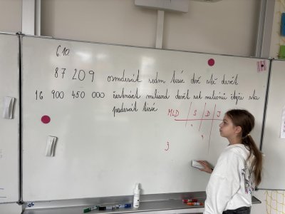 V hodinách MAT pracujeme s velkými čísly. Uvědomujeme si jednotlivé řády, čísla čteme, zapisujeme a přiřazujeme na číselnou osu.