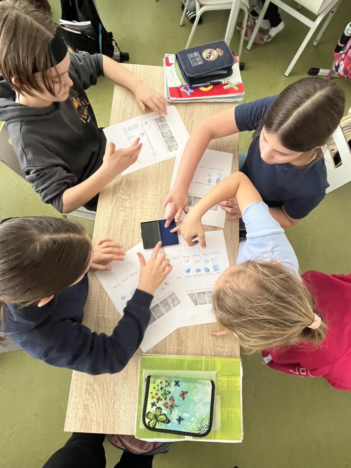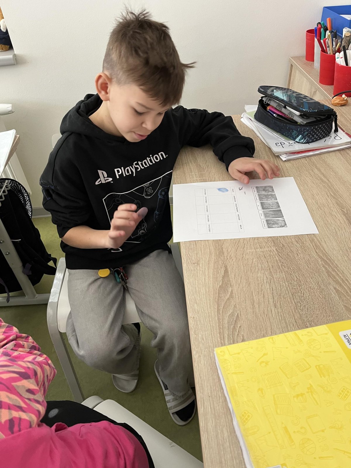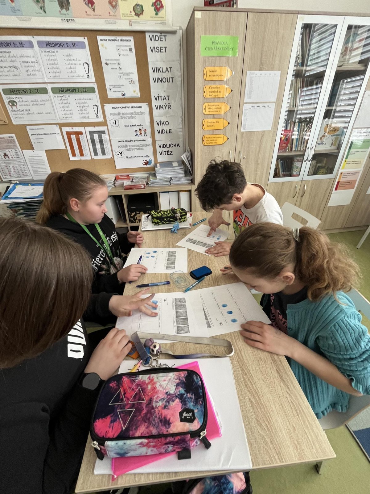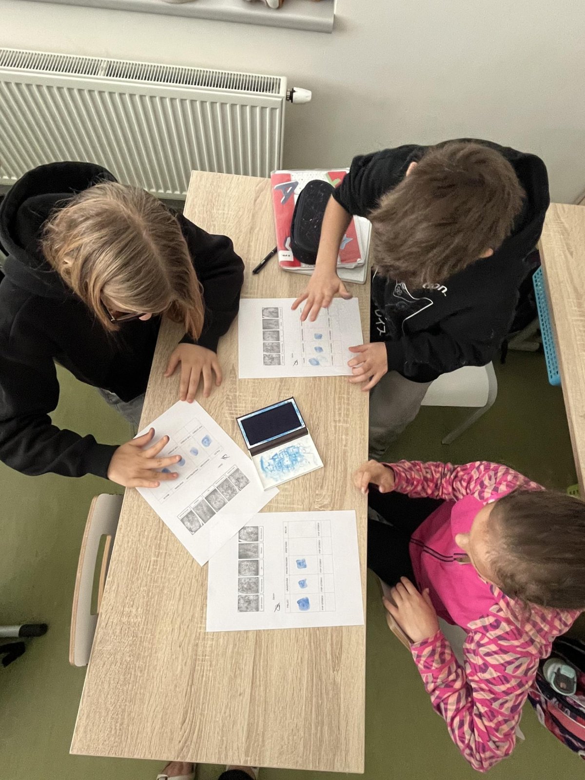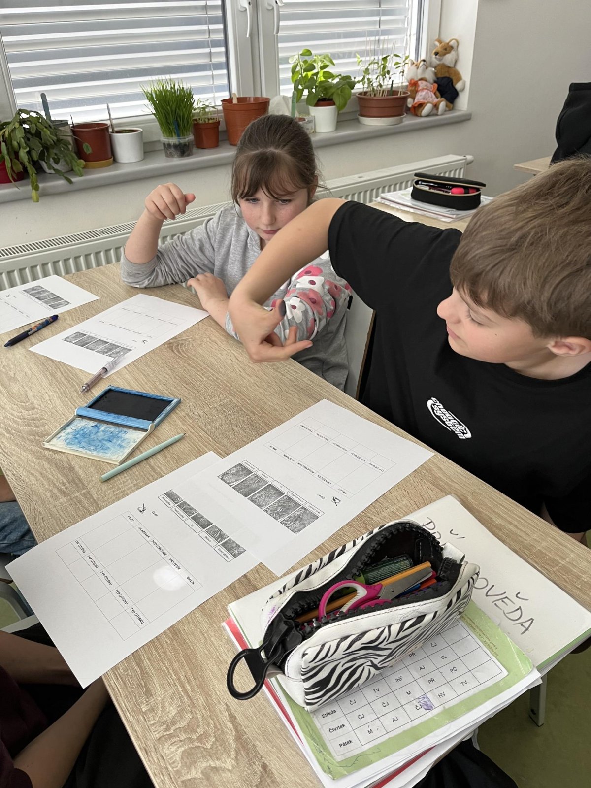 V hodině přírodovědy jsme pracovali badatelsky a zkoumali jsme lidskou kůži. Pomocí inkoustu jsme si vytvořili vlastní otisky prstů, které jsme následně pozorovali. Zjistili jsme, že každý otisk je jedinečný, skládá se z různých linií a tvarů. Snažili jsme se své otisky přiřadit k základním typům papilárních linií. Díky této aktivitě jsme lépe pochopili stavbu kůže i význam otisků prstů v praxi.